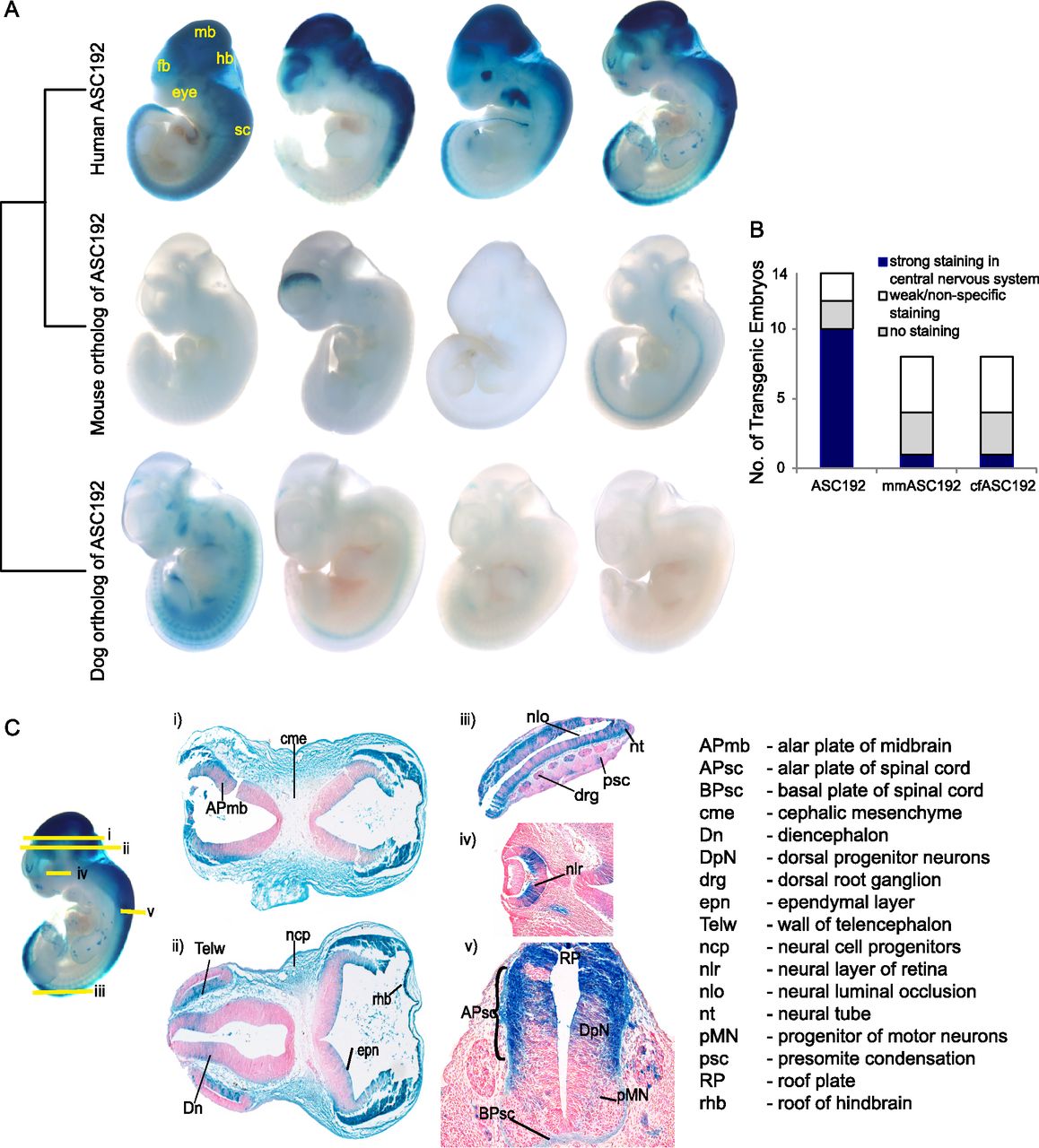 Primate-specific enhancer function of ASC192. (A) ASC192 drives consistent primate-specific lacZ expression in the developing central nervous system of E11.5 mouse embryos; four representative embryos are shown for each construct: (fb) forebrain; (mb) midbrain; (hb) hindbrain; (sc) spinal cord. For the entire set of transgenic embryos, see Supplemental Figures S4–S6. (B) Enhancer success rates for ASC192 and its orthologs: ASC192 drove strong lacZ expression in 10/14 transgenic embryos, whereas the mouse and dog orthologs of ASC192 drove strong reporter gene expression in only 1/8 transgenics. (C) Transverse sections of a representative ASC192 embryo; strong expression is visible in forebrain, midbrain, and hindbrain (i, ii). lacZ expression coincides with neuroepithelial zones that spawn neural progenitors (iii, v) and also with neural retina (iv). In the spinal cord, lateral to the roof and floor plates, enhancer activity localizes to regions containing dorsal spinal interneurons and motor neuron progenitors (v).