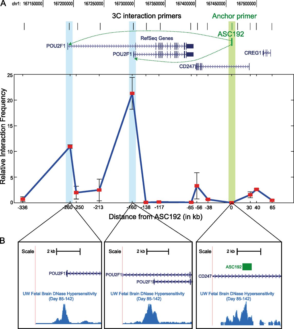 3C assay demonstrates looping between ASC192 and POU2F1. (A) Black ticks indicate locations of primers designed to capture long-range DNA interactions with ASC192. Locus-wide relative interaction frequencies reveal that ASC192 interacts most strongly with the two promoters of POU2F1. Error bars represent one standard deviation. (B) DNase-seq signal at ASC192 and the POU2F1promoter regions indicate an open chromatin conformation in human fetal brain.