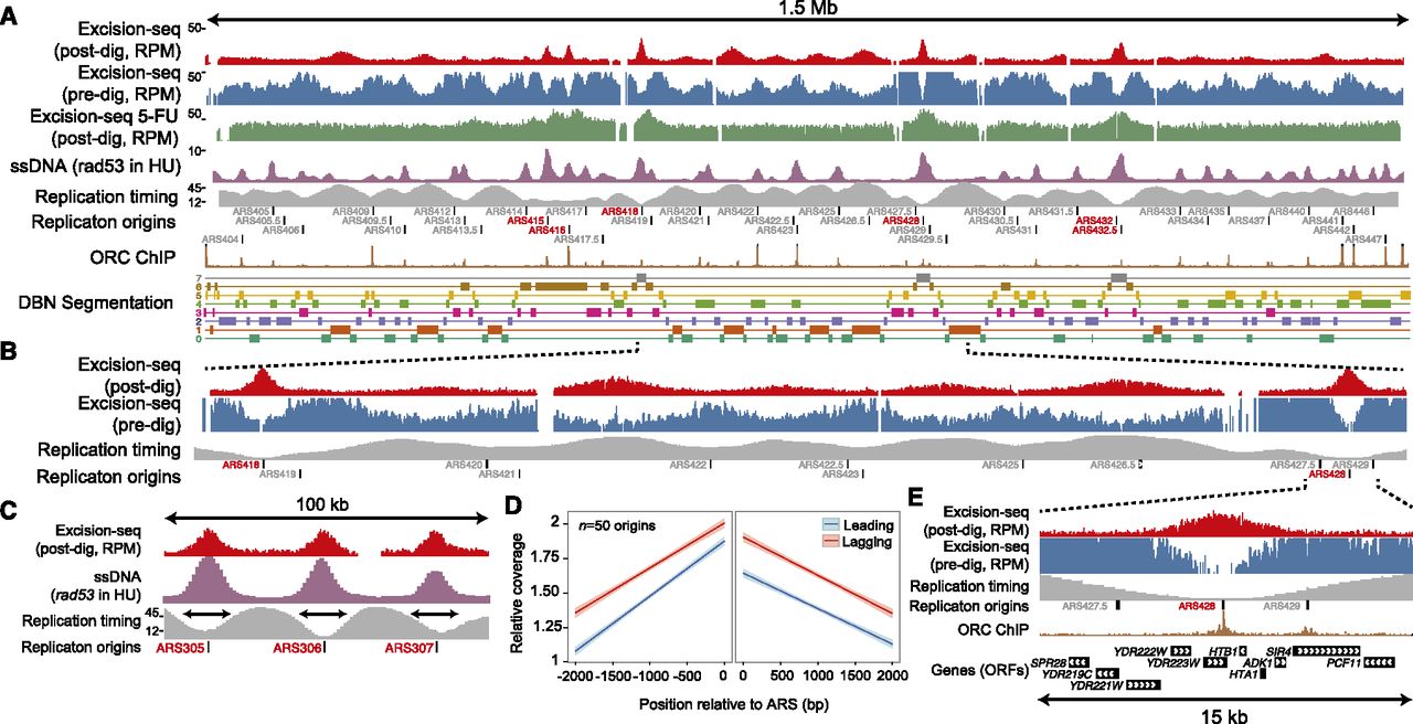 Excision-seq maps of uracil content in the budding yeast genome. (A) Data showing the entire yeast chromosome 4 for dut1-1 ung1∆ yeast using post-digestion Excision-seq (red, reads per million [RPM]), predigestion Excision-seq (blue, RPM), post-digestion Excision-seq data for ung1∆ yeast treated with 5-fluorouracil (5-FU) (green, RPM), single-stranded DNA accumulation caused by hydroxyurea treatment of a rad53 yeast strain (purple, arbitrary units) (Feng et al. 2006), replication timing data (Trep, minutes replicated after G1 release) (Raghuraman et al. 2001) (gray), annotated origins of replication (Nieduszynski et al. 2007), ORC chromatin immunoprecipitation signals (Eaton et al. 2010) (brown, coverage), and labeled segments from an eight-state DBN segmentation (Hoffman et al. 2012) incorporating replication timing (Yabuki et al. 2002) and post-digestion Excision-seq mapping of uracil. (B) A 450-kb region of chromosome 4 highlights patterns of uracil incorporation in early-replicating origins (ARS418 and ARS428), as well as uracil depletion in late-replicating regions. (C) Correspondence of peak widths between post-digestion Excision-seq (red) and ssDNA accumulation (Feng et al. 2006) (purple) at three early-replicating origins in a 100-kb region of chromosome 3. (D) Post-digestion Excision-seq measurement of uracil content for 50 early-replicating origins. Lagging strands have ∼1.3-fold higher relative coverage than leading strands in post-digestion Excision-seq data, reflecting increased uracil content in leading strands. (E) A 15-kb region of chromosome 4 highlights patterns of uracil incorporation at the early-replicating origin ARS428.