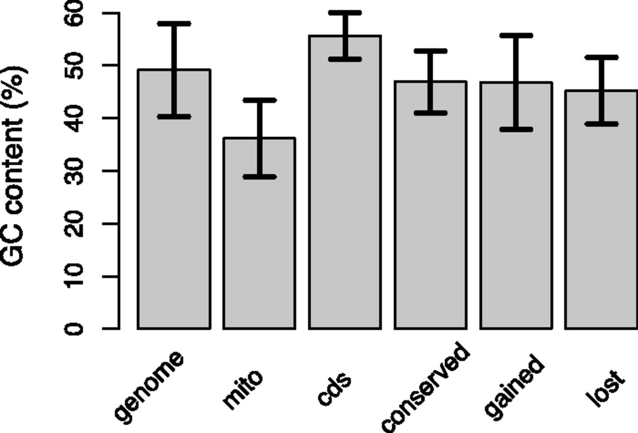 GC content for the nuclear genome, the mitochondrial genome, all pooled coding sequences (CDS), and for conserved, gained, and lost introns, from left to right. Standard error is plotted on each bar.