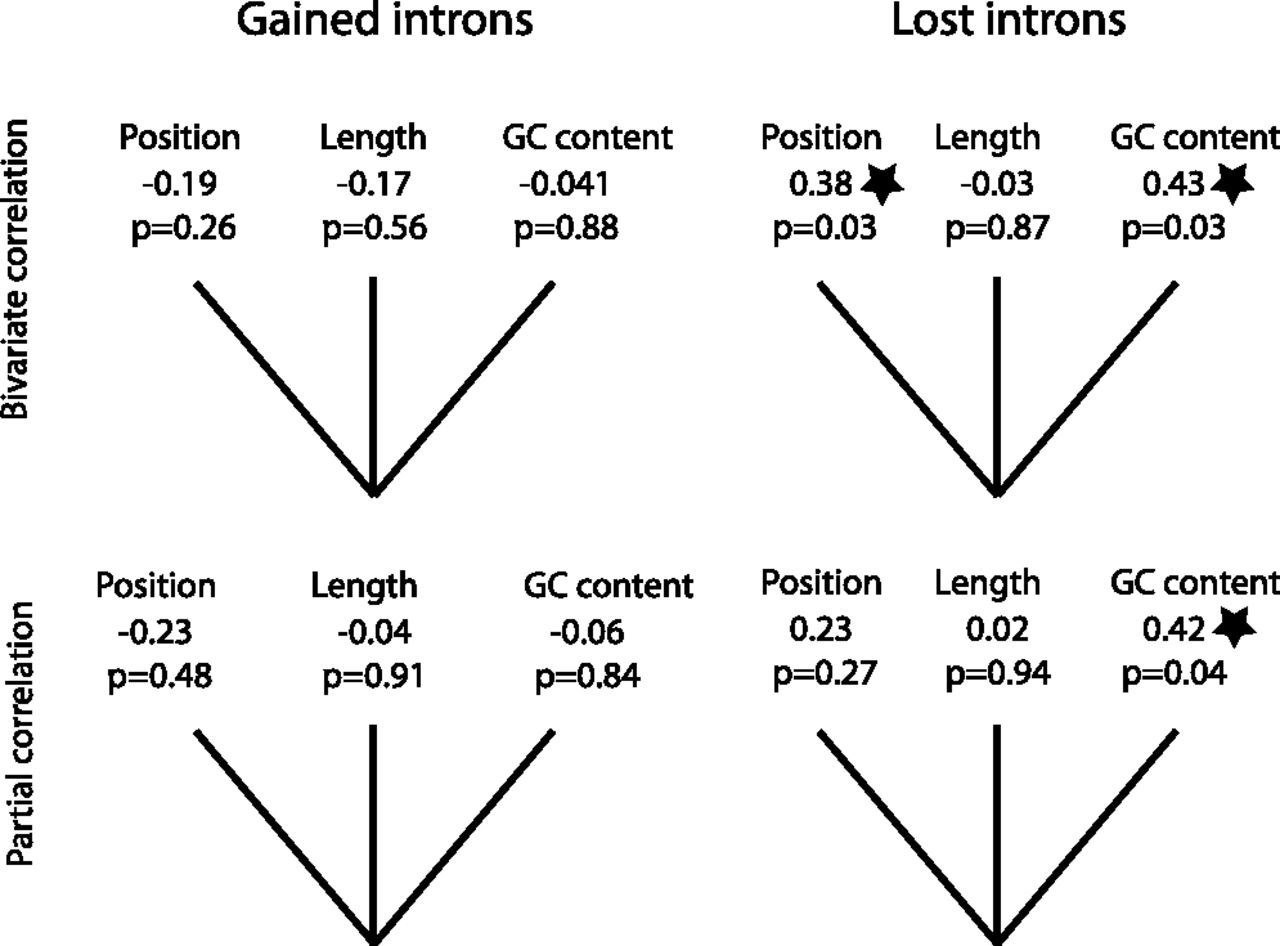 Bivariate and partial correlation test between intron population frequency and intron position, length, and GC content for gained and lost introns. The correlation coefficient and P-value are listed below each category. Tests with statistically significant results are marked with stars.