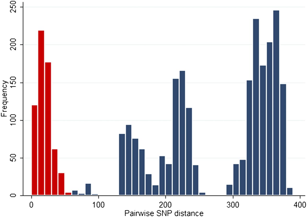 Histogram of pairwise SNP differences between 76 isolates from 46 patients and five healthcare workers. SNPs differences between isolates from the same clade are represented in red, and between isolates in different clades in blue.