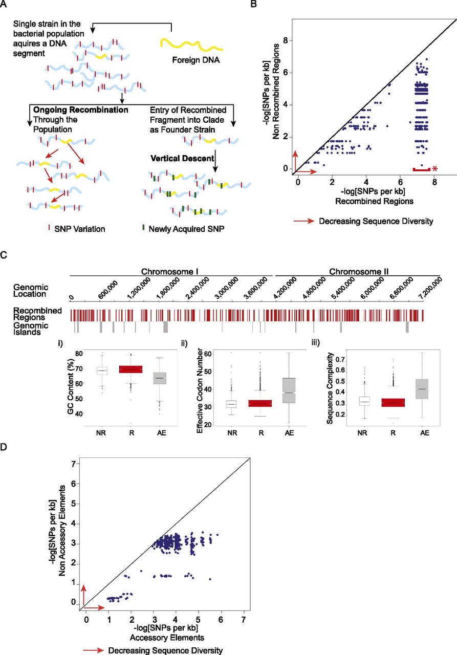 Distinguishing between ongoing recombination and vertical descent and in Bp. (A) Alternative models for clade-specific recombination haplotypes. (Left) In the “Ongoing Recombination” model, an imported fragment sweeps through the population via recombination, resulting in homogenization of the recombining fragment across strains. The recombining fragment should show lower levels of sequence diversity compared to nonimported regions. (Right) In the “Vertical Descent” model, an ancestral strain acquires a genomic fragment (yellow) from an external strain and subsequently transmits that fragment to all daughter strains in a clonal fashion. In this model, the imported fragment should accumulate new point mutations (green bars) at a similar rate to nonimported regions. (B) Within-clade sequence diversity of recombined regions compared to nonrecombined regions. Scatter plots comparing within-clade sequence diversity values of individual recombined regions (x-axis) to nonrecombined regions (y-axis) for the same strains in a given clade. Sequence diversity decreases in the direction of the red arrows (to right and upward). (*) Data points highlighted by the red bar correspond to recombined regions exhibiting 100% sequence identity. To visualize these points in a manner that captures both their density and extremely low sequence diversity, these were plotted within the x-axis range of 6.9–7.6 on a negative log scale. Sequence diversity is defined as the number of SNPs per kb. (C) Sequence features of nonrecombined regions (NR), recombined regions (R), and accessory elements (AE). (Top) Bp K96243 genomic tracks of Chr I and Chr II. Row 1: Genomic locations of recombined regions (red). Row 2: Genomic locations of 16 known Bp genomic islands (gray). (Bottom) Sequence feature comparison of genes in nonrecombined (white; NR), recombined (red; R), and accessory elements (gray; AE): (i) GC content (Puigbò et al. 2008); (ii) effective codon number (Puigbò et al. 2008); and (iii) sequence complexity (Pietrokovski et al. 1990). Each hourglass plot spans the 25th to 75th percentile (interquartile range [IQR]) of all genes in that category, with the bottleneck at the median. Horizontal tick marks show data ranges within 1.5 × IQR of the 25th and 75th percentiles. Open circles represent outliers outside this range. The width of the bottleneck (i.e., the length of the V-shaped notch) depicts the 95% confidence interval for the median. (D) Within-clade sequence diversity of accessory elements compared to nonaccessory elements. Accessory elements are defined as regions not present in the BpK96243 reference strain (see Methods). Scatter plots compare average sequence diversity values for individual accessory elements (x-axis) to corresponding nonaccessory elements (y-axis) for the same strain pairs in a given clade. Sequence diversity is defined as the number of SNPs per kb.