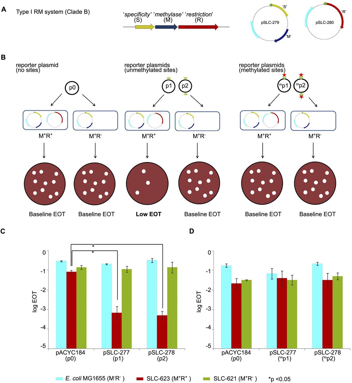 Restriction of non-self DNA by clade-specific Bp RM systems. (A) Molecular cloning of a Type I RM system specific to Bp genomic Clade A. The RM system comprises three genes: (R) “restriction,” (M) “methylase,” (S) “specificity.” Genes S (yellow) and M (blue) were cloned in plasmid pSLC-279 with kanamycin resistance (KmR) to give the M+ plasmid. Gene R (red) was cloned in plasmid pSLC-280 with ampicillin resistance (ApR) to give the R+ plasmid. Resistance genes are depicted in cyan. Green arrows represent the T5 promoter used to induce expression of the cloned genes. Plasmids are not drawn to scale. (B) Efficiency of transformation (EOT) assay. Reporter plasmids p0, p1, and p2 harbor zero, one, and two copies of the predicted Type I recognition site (5′-GTCATN5TGG-3′; indicated by green triangles). Plasmid p0 should not show any EOT changes because it does not contain Type I recognition sequences. Unmethylated plasmids p1 and p2, when transformed into M+R+ strains, should be recognized via their Type I sites and cleaved by the Type I restriction enzyme (registered as a drop in number of transformants). However, when transformed into M+R− strains that express the methyltransferase alone, no EOT differences should be observed. In contrast, methylated p1 and p2 plasmids (obtained by passage through M+R− strains; methylated sites indicated by red stars and superscript m), when transformed into M+R+ strains, should be recognized as “self” DNA by the Type I system and resist cleavage, resulting in minimal EOT changes. (C) EOT assay results using unmethylated plasmids. Host strains are MG1655 (M−R−, no RM system, cyan); SLC-623 (M+R+, complete RM system, red); and SLC-621 (M+R−, methyltransferase only, green). Reporter plasmids are pACYC184 (p0, control plasmid); pSLC-277 (p1, 1 recognition site); and pSLC-278 (p2, 2 recognition sites). Significant differences in EOT are observed between control plasmid p0 and plasmids p1 and p2 when transformed into M+R+ strains (P < 0.01) but not in host E. coli or M+R− strains. EOT in this study is the normalized number of CmR transformants obtained per unit amount of plasmid DNA. (D) EOT assay using methylated plasmids. Reporter plasmids were passaged through M+R− strains prior to transformation, which is predicted to cause recognition site methylation. No significant EOT differences are observed across the strains. All experiments were performed in triplicate, and data are presented as mean and standard deviations. Data are presented as log10 values of EOT. Student’s t-test was used to test for significant differences.