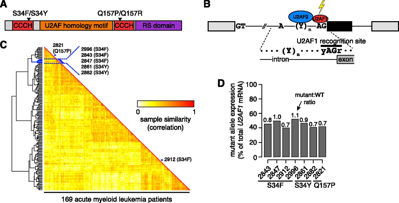 U2AF1 mutations contribute to splicing programs in AML. (A) U2AF1 domain structure (Kielkopf et al. 2001; The UniProt Consortium 2012) and common mutations. (CCCH) CCCH zinc finger. (B) Schematic of U2AF1 interaction with the 3′ splice site of a cassette exon (black). (C) Heat map illustrating similarity of alternative splicing programs in AML transcriptomes. Dendrogram is from an unsupervised cluster analysis based on cassette exon inclusion levels. (Blue) Samples with U2AF1 mutations. (D) U2AF1 mutant allele expression as a percentage of total U2AF1 mRNA in AML transcriptomes. Numbers above bars indicate the ratio of mutant to WT allele expression.