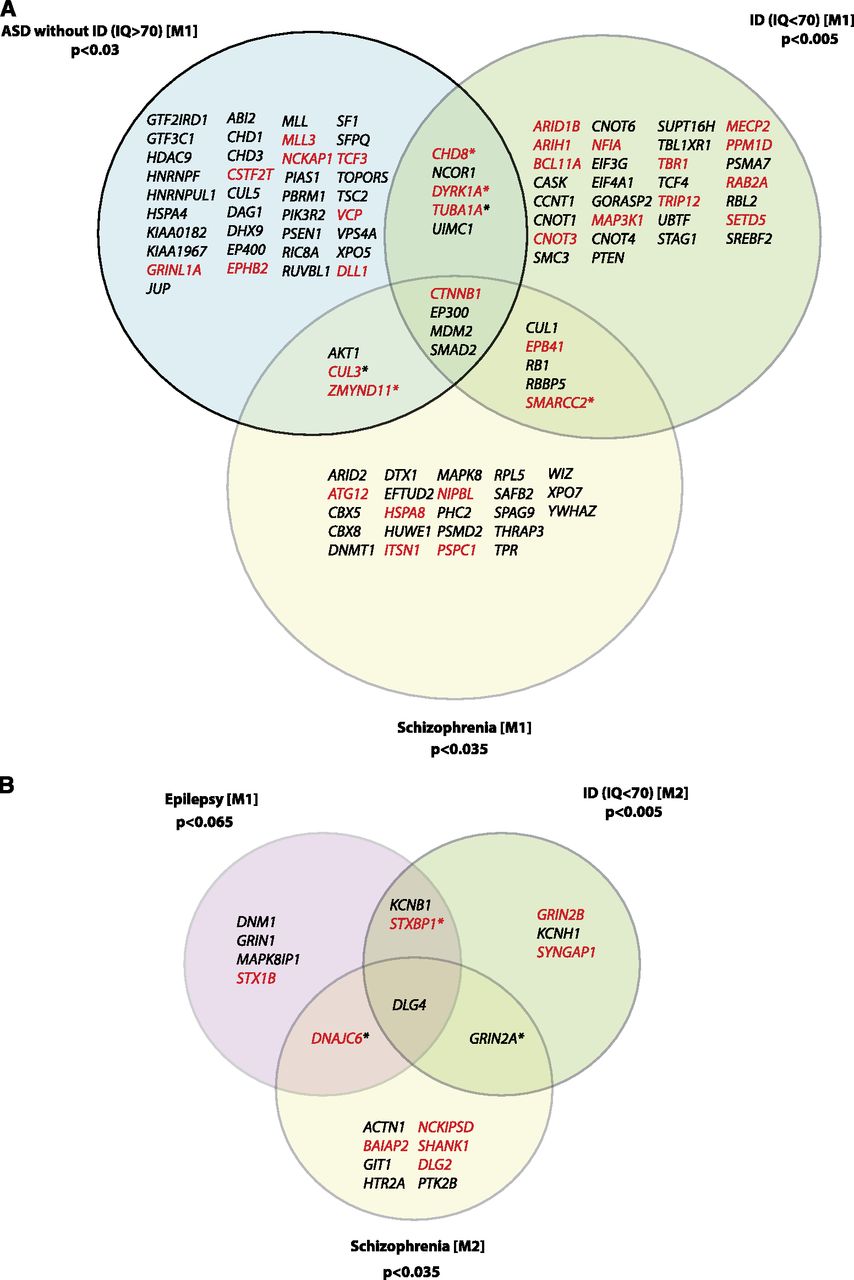 Overlap of the modules identified for different neurodevelopmental diseases. (A) Venn diagram representing the overlap between genes that carry de novo mutations and are detected as part of the first modules when analyzing ASD without ID (IQ ≥ 70), ID with or without reported ASD (IQ < 70), and schizophrenia. Genes with LoF mutations are colored in red. Genes with only missense mutations are colored in black. Asterisks indicate genes for which mutations have been observed in two different groups. (B) Venn diagram representing the overlap between genes that carry de novo mutations and are detected as part of the second module of ID, the second module of schizophrenia, and the first module of epilepsy. The P-value reported for each disease is the maximum P-value of the three null models.