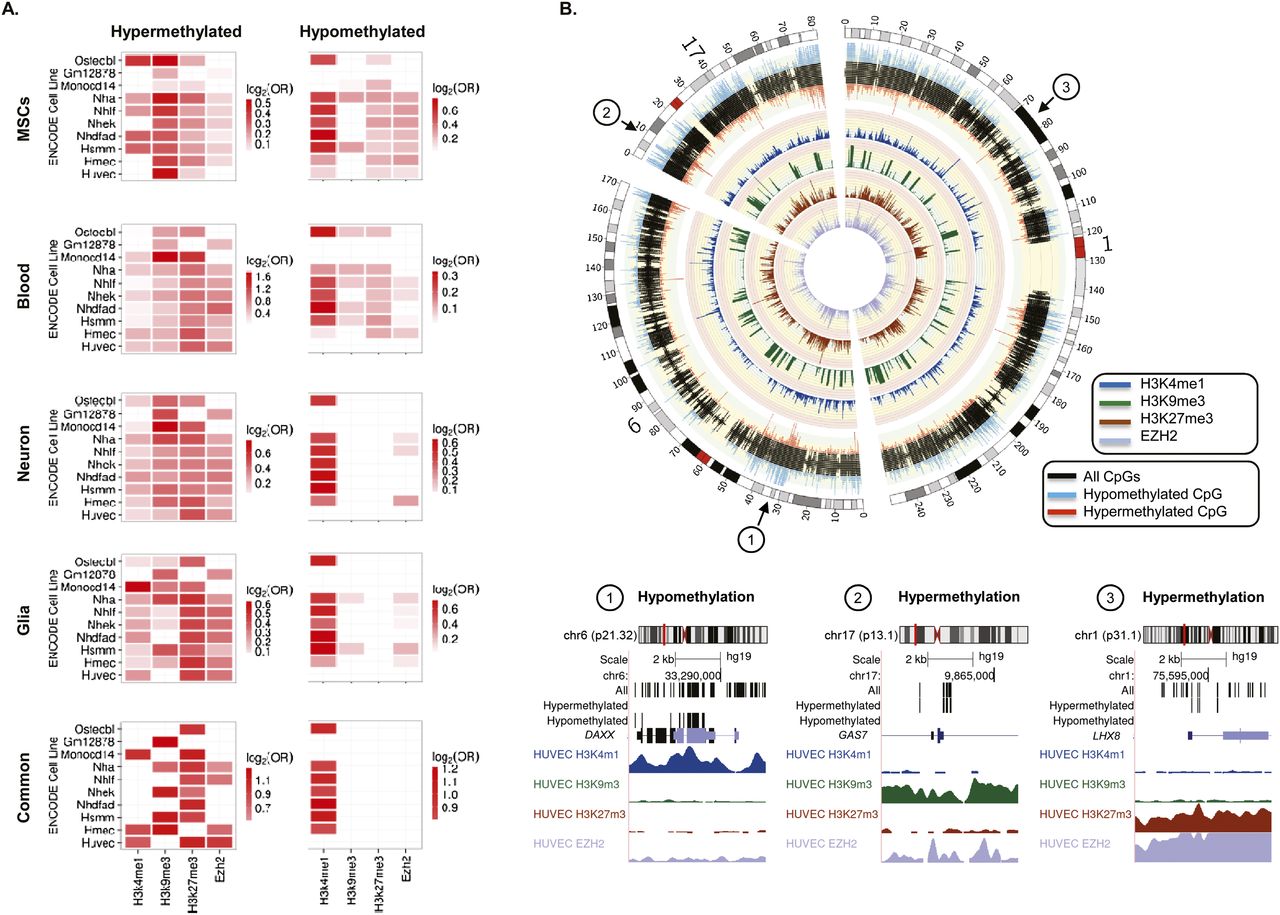 Chromatin signatures associated with DNA methylation changes during aging. (A) Heatmaps showing significant enrichment of hyper- and hypomethylated CpG sites—identified in MSCs, blood, neurons, and glia—with different histone marks and chromatin modifiers contained in the UCSC Genome Browser Broad histone track from the ENCODE Project. Color code indicates the significant enrichment based on log2 odds ratio (OR). (B) Circular representation of three representative chromosomes (1, 6, and 17), indicating whether the CpGs were hypermethylated (red) or hypomethylated (blue) during MSC aging. Inner tracks display chromatin marks (H3K4me1, H3K9me3, H3K27me3, and EZH2) generated for HUVEC cells and associated with differentially methylated regions during aging. Broad histone peak information was averaged in 200-kbp genomic windows and represented as histogram tracks. Three examples of hypo- and hypermethylated DNA regions associated with specific chromatin signatures are displayed below.