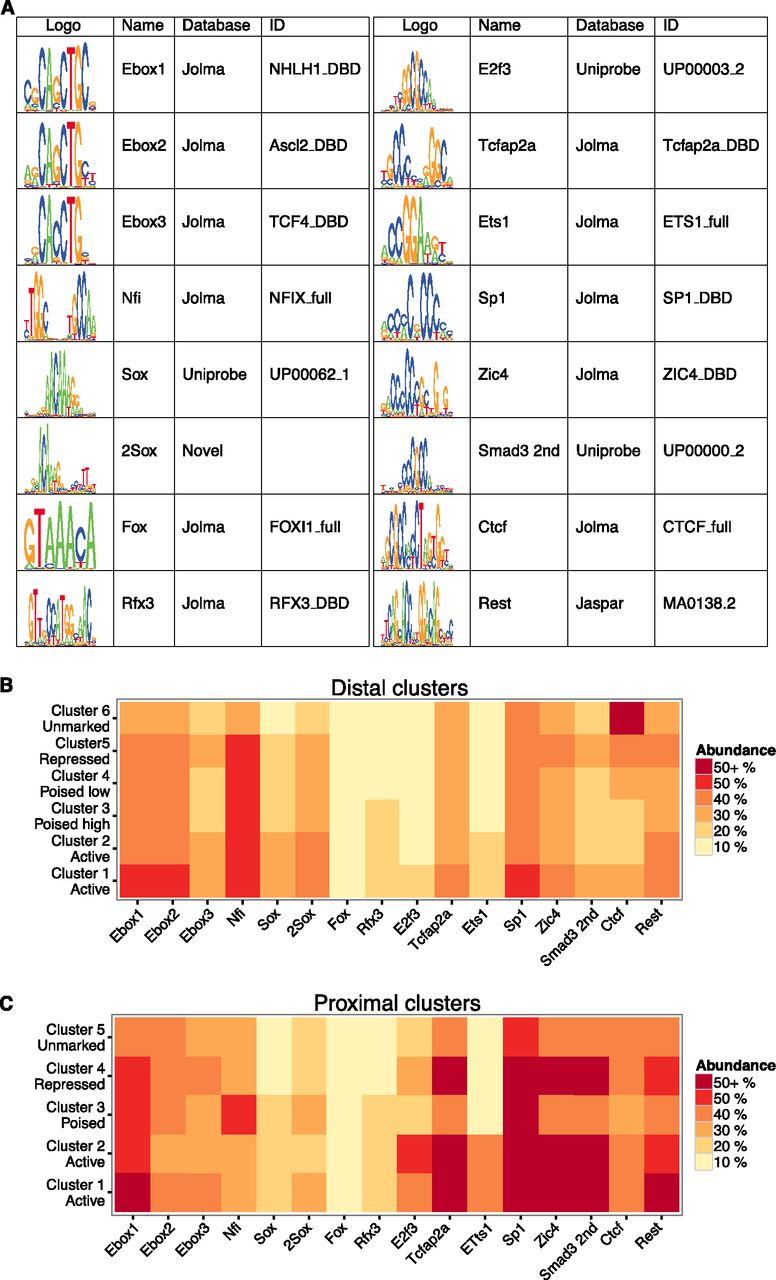 Differential TF motif enrichment within the different CRE classes. (A) The set of 16 TF motifs found to be enriched in at least one of the different DHS clusters (see Methods). Motif logos, the name employed in this study, and the motif database source and respective identifier are presented. (B,C) Heatmap representation of the abundance of the 16 TF motifs in each of the distal (B) and proximal (C) clusters of DHSs, binned in 10% intervals.