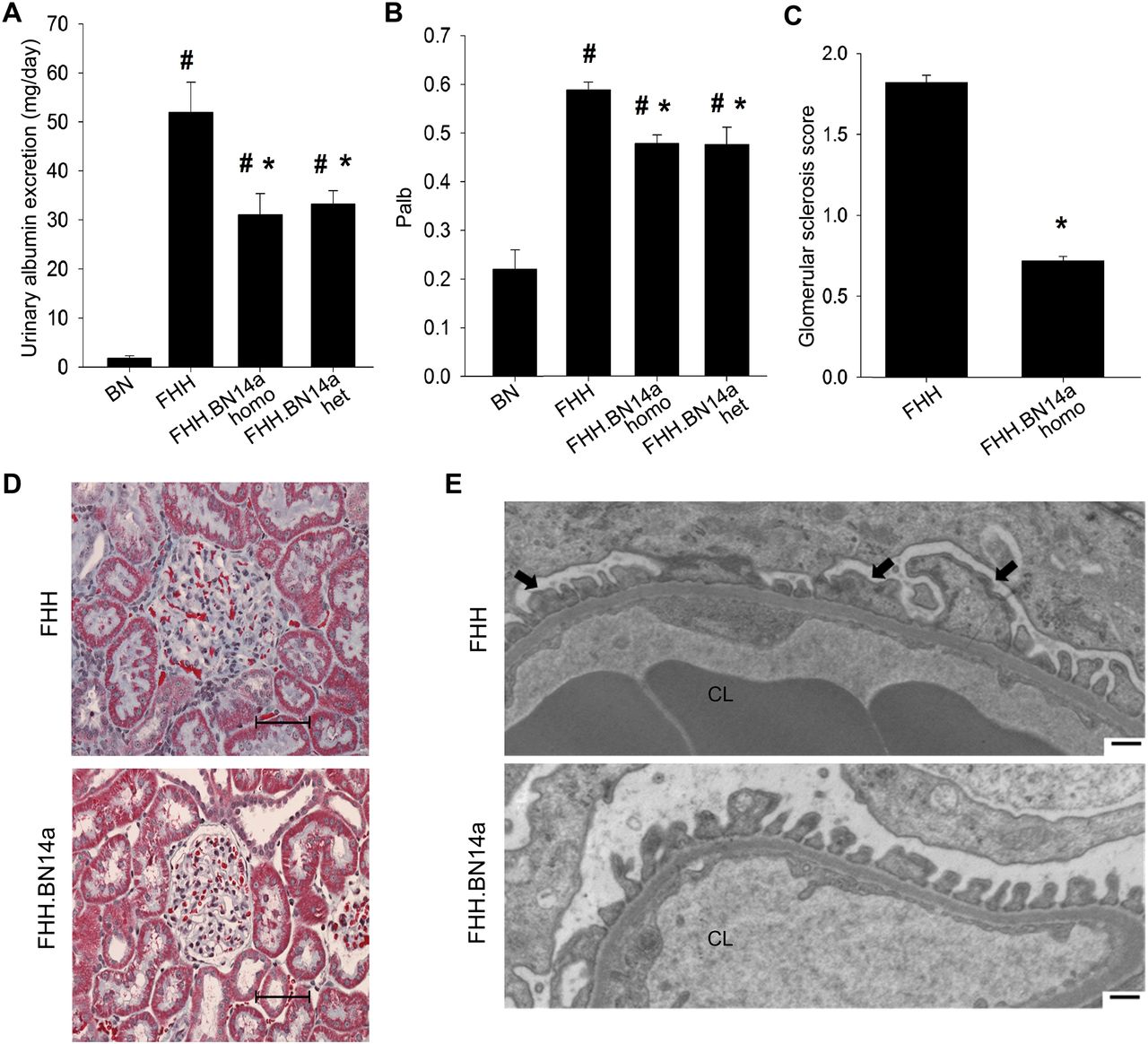 Introgression of the BN Shroom3 gene onto FHH background improves glomerular and overall kidney function. (A) At 14 wk of age, both homozygous and heterozygous FHH.BN14a congenic animals showed a significantly lower degree of albuminuria compared to FHH (n = 4, 7, 8, and 3, respectively). (B) Both heterozygous and homozygous FHH.BN14a demonstrated significantly improved glomerular permeability (Palb) compared to FHH. (n = 4 animals/115 glomeruli, 3 animals/76 glomeruli, and 2 animals/70 glomeruli, respectively. Palb in BN was obtained from previously published data [Rangel-Filho et al. 2005].) (C) FHH.BN14a kidney showed a decreased presence of glomerular sclerosis compared to FHH at 14 wk of age. A minimum of 30 glomeruli from three kidneys for each strain were scored for a percentage of sclerosis using a scale from 0 (no sclerosis) to 4 (complete sclerosis). (D) Representative trichrome-stained images of glomeruli from FHH and FHH.BN14a are shown. Fibrotic tissues are indicated by blue stain. Scale bars = 50 µm. (E) Electron microscopic images of glomeruli showed podocyte foot process fusion (indicated by arrow) in FHH compared to FHH.BN14a animals at 18 wk of age. Scale bars = 500 µm. (CL) Capillary lumen, (*) P < 0.05 vs. FHH, (#) P < 0.05 vs. BN.