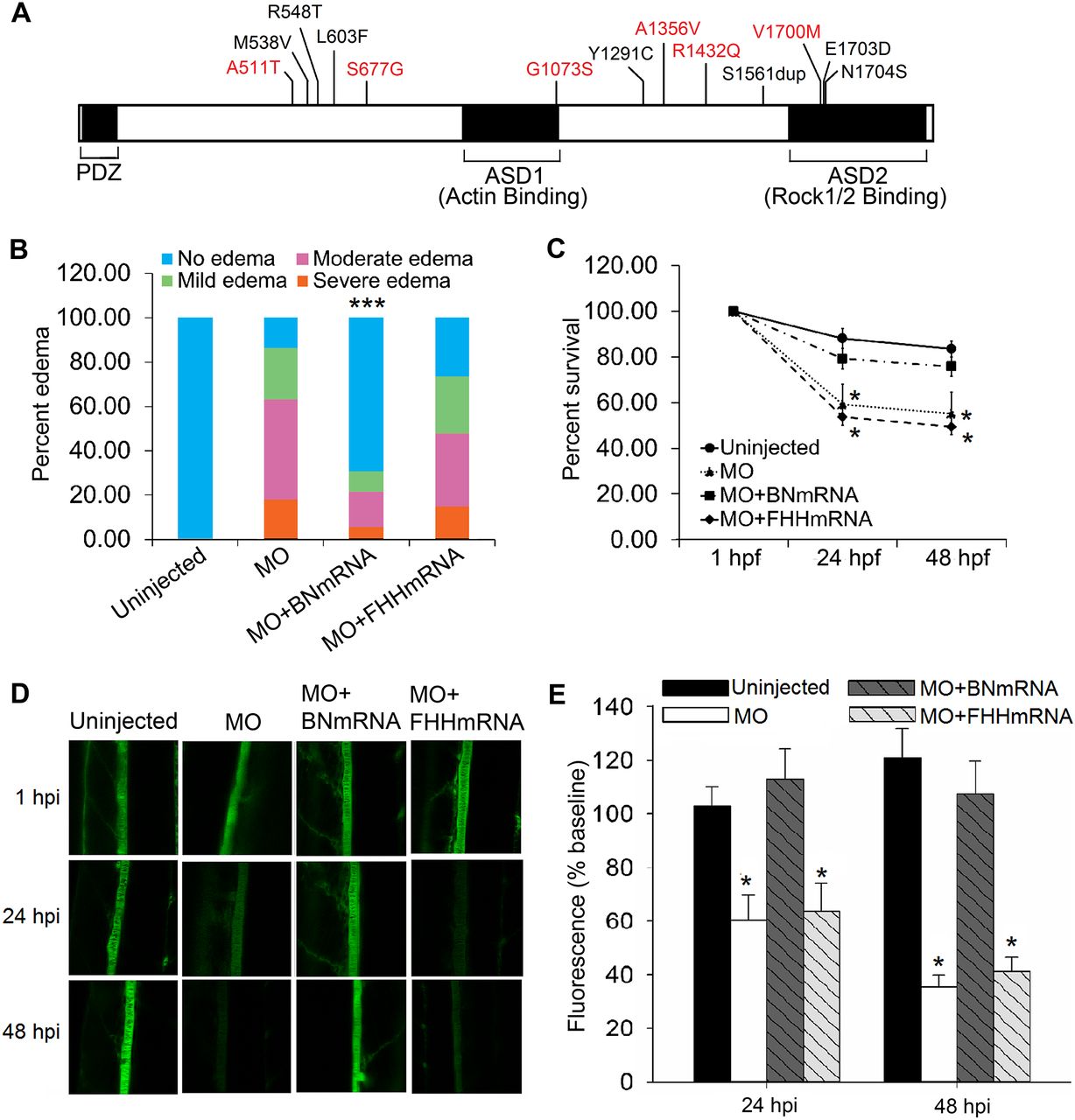 FHH Shroom3 is defective and contributes to glomerular dysfunction. (A) Schematic representation of the rat Shroom3 protein is shown. Vertical lines represent the amino acid variants found in FHH Shroom3. Variants predicted to be damaging by PolyPhen-2 are shown in red. (B) Co-injection of shroom3 + tp53 morpholino (MO) with full-length BN, but not FHH, Shroom3 mRNA rescued the edema phenotype. ([***] P < 0.001 vs. MO and MO + FHHmRNA) and (C) cell death induced by shroom3 + tp53 MO ([*] P < 0.05 vs. uninjected control). (D) Representative fluorescence images of individual dorsal aorta at 1, 24, and 48 h following 70-kDa dextran injection are shown. (E) Co-injection with BN but not FHH Shroom3 mRNA rescued the dextran leakage induced by knockdown of endogenous shroom3 in zebrafish. (n = 35, 26, 23, and 22, respectively. [*] P < 0.05 vs. uninjected and MO + BNmRNA.)