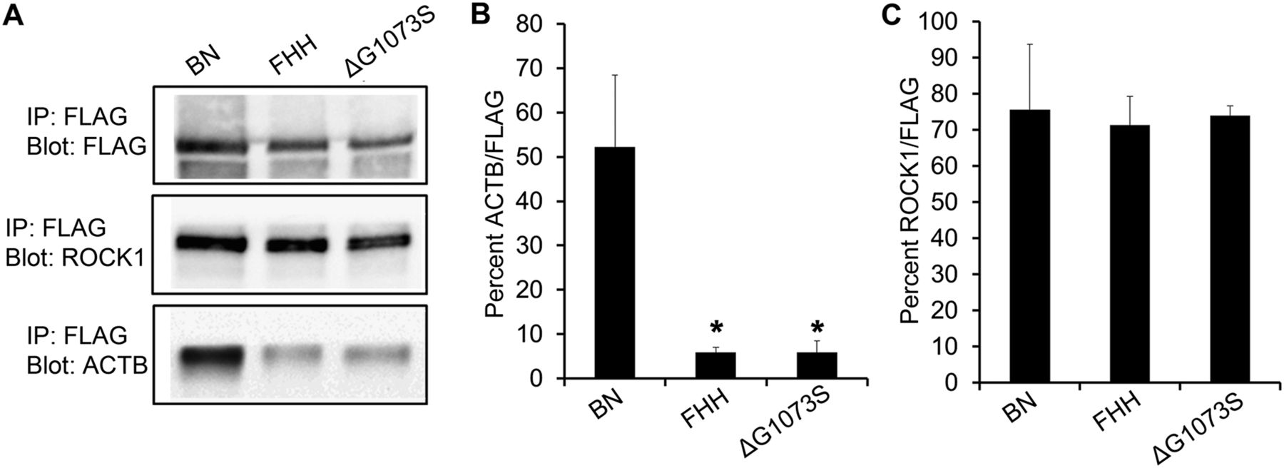 The G1073S variant decreases the actin-binding affinity of SHROOM3 protein. (A) FLAG-tagged BN, FHH, or ∆G1073S SHROOM3 proteins were overexpressed in HEK293 cells, followed by immunoprecipitation against FLAG. Immunoprecipitated lysates were immunoblotted using antibodies against FLAG, ROCK1, and ACTB. A representative Western blot of immunoprecipitated lysate is provided. (B) Quantification of the Western blot showed that FHH SHROOM3 and ∆G1073S mutant had significantly reduced actin-binding affinity compared to BN SHROOM3. (n = 3 per group. [*]P < 0.05 vs. BN.) (C) ROCK1-binding affinity was not different among the three alleles (n = 3 per group).