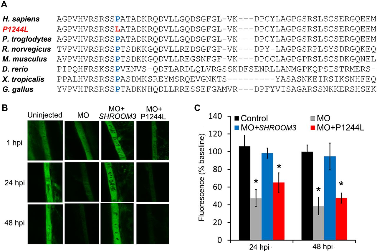 rs181194611 (p.P1244L) associated with nondiabetic ESKD impairs SHROOM3 function in vivo. (A) Proline at the amino acid position 1244 in SHROOM3 is evolutionarily conserved. (B) Representative images of dorsal aorta at 1, 24, and 48 h following 70-kDa dextran injection are shown. (C) Co-injection of nonmutated human SHROOM3 mRNA restored normal glomerular permeability, while ∆P1244L failed to show functional rescue. (*) P < 0.05 vs. uninjected.