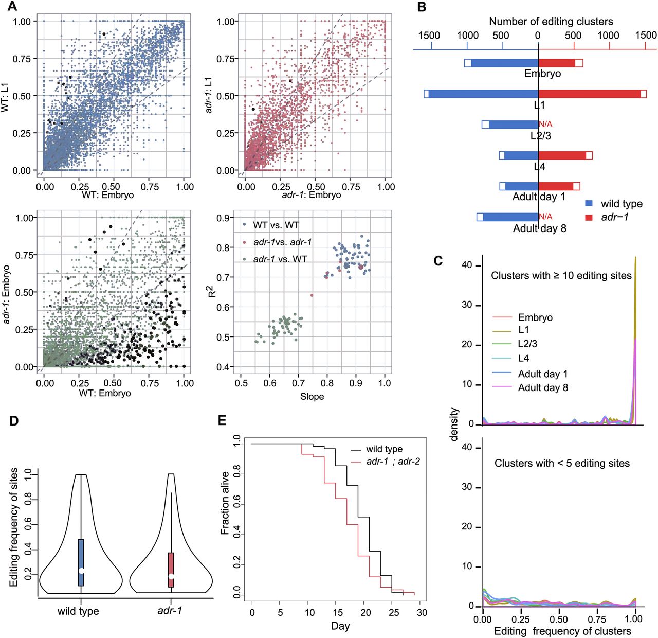 Characteristics of RNA editing in ADAR mutant strains compared with the wild type. (A) Pairwise comparison of RNA editing frequency at each site between samples. Three scatter plots illustrate the comparison of RNA editing site frequency between three pairs of samples. (Blue) Wild-type vs. wild-type; (red) adr-1 vs. adr-1; (green) wild-type vs. adr-1. Black dots highlight sites with significant differences in editing frequency between samples (Fisher’s exact test, corrected P < 0.01). Linear regression was performed for each pair of samples, and the slope and R2 were plotted in the lower right panel. (B) Number of editing clusters in each sample. Filled bars depict the number of editing clusters. Empty bars depict the number of expressed clusters not edited in this sample but edited in at least one other sample. (C) Density plot of the number of RNA editing clusters over editing frequency at different developmental stages. For clusters with 10 or more editing sites, there was generally a peak near 100% of editing frequency. For clusters with less than five editing sites, the density curves were generally flat with a rise near zero. Lines of different colors indicate different developmental stages. (D) Violin plot of the distribution of RNA editing frequency in the wild type and the adr-1 mutant. The adr-1 mutant had reduced RNA editing frequency. (E) adr-1; adr-2 mutant worms have a shortened lifespan at 20°C (log-rank test, P = 0.004).