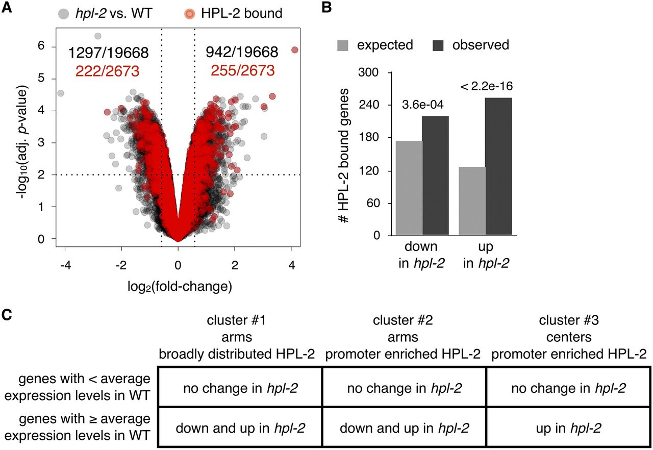 HPL-2 likely directly regulates the expression of some genes it binds. (A) Volcano plot depicting log2(fold-change) versus −log10(adjusted P-value) for mRNA levels of 19,668 genes from microarray transcript profiling of hpl-2 mutant embryos compared to wild-type (WT) embryos (gray), with genes that are bound by HPL-2 (red). Significantly misregulated genes were defined as those having mRNA levels that showed a fold-change of at least ±1.5 and an adjusted P-value < 0.01. (B) Expected versus observed numbers of genes that are bound by HPL-2 and significantly down- or up-regulated in hpl-2 mutants. Displayed P-values were calculated using the χ2 test. (C) Table showing how HPL-2-bound genes within the three clusters defined in Figure 5B displaying below- or equal-to-or-above-average expression levels in wild type change in hpl-2 mutants (P < 0.01). See Supplemental Figure S7 for histograms of the data.
