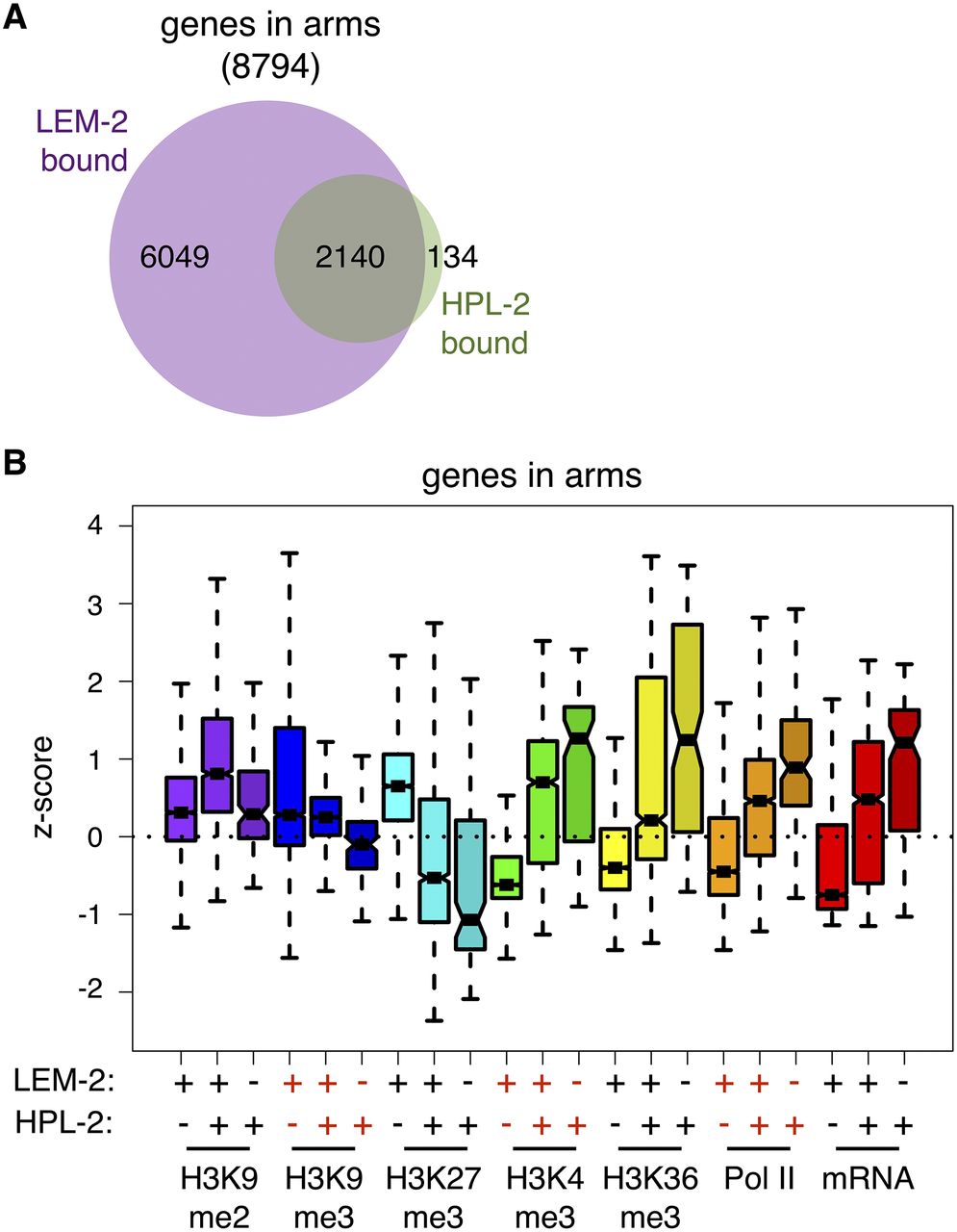 HPL-2-bound genes that interact with the inner nuclear membrane are well expressed. (A) Venn diagram depicting the overlap of LEM-2-bound and HPL-2-bound genes in chromosome arms. (B) Box plots depicting median Z-scores of H3K9me2 (purple), H3K9me3 (blue), H3K27me3 (cyan), H3K4me3 (green), H3K36me3 (yellow), and Pol II (orange) ChIP-chip signal, as well as Z-scores of mRNA levels (red) of genes in arms bound by LEM-2 alone, both LEM-2 and HPL-2, or HPL-2 alone. Heatmaps of individual genes are shown in Supplemental Figure S8.
