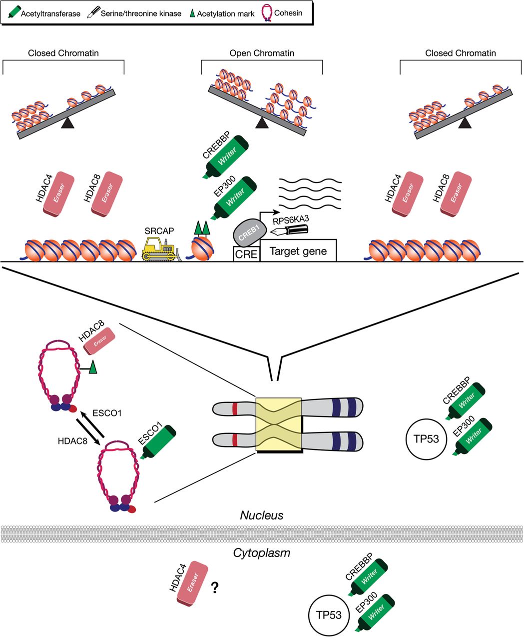 Acetylation machinery has diverse functions. A subset of target genes may require the presence of both copies of either of the histone acetyltransferases “writers” (CREBBP and EP300). The full complement of histone acetyltransferases may ensure open chromatin and expression from some loci (top, middle). Alternatively, other genes may be dominated by HDACs that favor repressed chromatin (top, sides). However, HDAC8 also plays a role in removing the acetylation mark from cohesins and may also have other roles in cytoplasm. Similarly, CREBBP and EP300 regulate other proteins such as TP53 through acetylation in nucleus and ubiquitination in the cytoplasm. There are also other components that interact with the components of the epigenetic or cohesion machinery, such as RPS6KA3 and ESCO1, that also lead to intellectual disability.