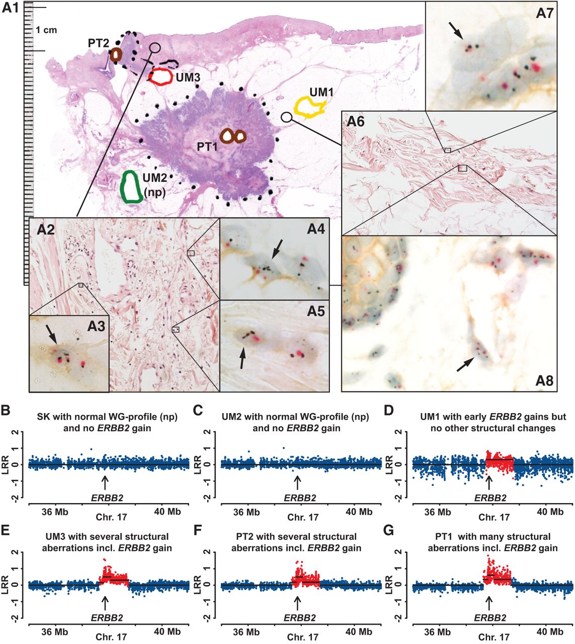 Comprehensive analysis of pathology, gene copy number, and gene expression for case MA018, showing evidence for increased copy number and expression of ERBB2 in normal epithelial as well as in normal mesenchymal cells. (A1) A large-format histology slide of breast tissue stained with hematoxylin and eosin, with diagnosis of multifocal invasive ductal carcinoma (HER2+, non-luminal). Areas of tissue samples taken for DNA extraction, prior to formalin fixation of the tissue, are marked with colored thick lines. Positions of two primary tumors 1 and 2 (PT1 and PT2) are shown in brown. UM1, UM2, and UM3 are labeled in yellow, green, and red, respectively. (np) Normal genetic profiles (see also below, B–G). Two cores from paraffin-embedded breast tissue (thin-lined black circles) surrounding samples UM1 and UM3 were taken for separate analysis using the HER2 tricolor Dual ISH DNA Probe Cocktail Assay (Roche) and the results are shown in A2–A8. Black arrows point to single nuclei of normal mesenchymal stromal cells and epithelial cells containing more than two copies of ERBB2 (black dots). The centromere of Chromosome 17 is stained in red. Note a weak but clearly discernible immunohistochemical staining of HER2 protein in the cell membrane of normal mesenchymal and epithelial cells upon high magnification. (B–G) A segment of Chromosome 17 containing ERBB2 from six samples from Illumina global genome analysis. Skin (SK, normal control tissue) and UM2 samples have normal profiles (np) with no gain of ERBB2. The remaining four samples were scored as containing an increased copy number (red dots) for ERBB2. The total size of aberrations in UM samples is as follows: UM98, 0.7 Mb (not shown in this figure); UM1, 0.9 Mb; UM3, >39% of the genome.