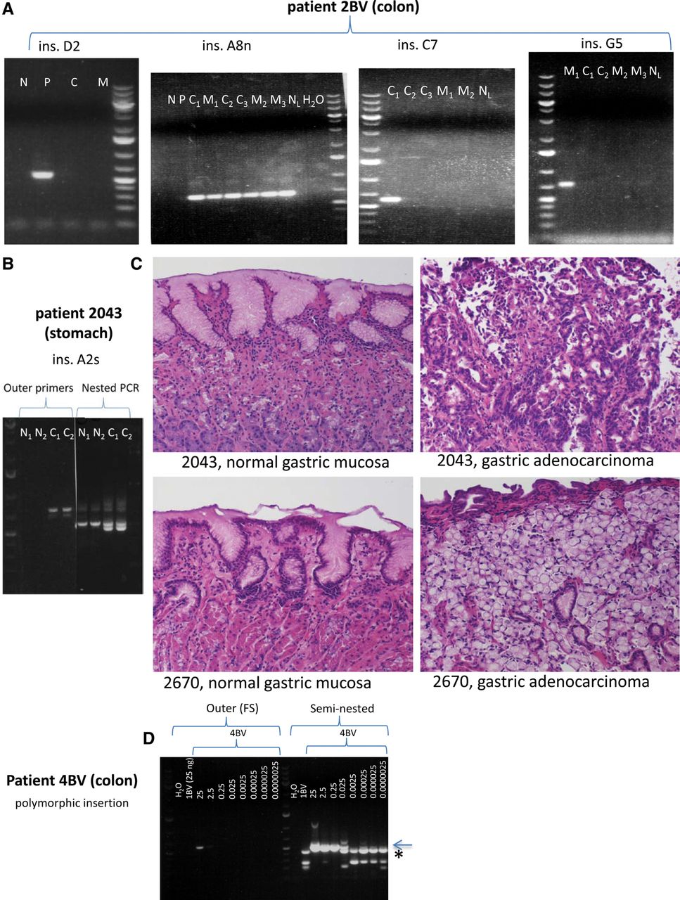 Representative examples of further somatic L1 insertions in colon cancer patient 2BV and gastric cancer patient 2043. (A) L1 insertions in colorectal cancer (all detectable by conventional PCR), from left to right: ins. D2 (polyp-specific, present exclusively in adenoma sample “5”); ins. A8n (cancer-and-metastasis-specific, present in three independent primary colorectal cancer sections and in three independent liver metastasis sections); ins. C7 (the only insertion in colon cancer cases that is detectable in only one tumor section, “6/1”); ins. G5 (a metastasis-specific insertion, present in only one of three sections of metastasis sample “7”). (N) Normal colon, (P) polyp, (C) primary colorectal cancer, (C1) primary colorectal cancer section 1, (C2) primary colorectal cancer section 2, (C3) primary colorectal cancer section 3, (M) metastasis, (M1) metastasis section 1, (M2) metastasis section 2, (M3) metastasis section 3, (NL) normal liver. (B) The fifth agarose gel shows the second somatic normal-and-cancer-specific L1 insertion in stomach cancer patient 2043 (detectable in cancer both by conventional and nested PCR, but detectable in normal stomach exclusively by nested PCR). (N1) Normal stomach section 1, (N2) normal stomach section 2, (C1) primary gastric cancer section 1, (C2) primary gastric cancer section 2. (C) Hematoxylin and eosin (H&E) staining revealed normal gastric mucosa in case of insertions A2s and C1s (Fig. 2C). (Top, left) Normal gastric mucosa from patient 2043; (top, right) gastric adenocarcinoma with intestinal differentiation from patient 2043. (Bottom, left) Normal gastric mucosa from patient 2670; (bottom, right) gastric adenocarcinoma with signet ring features from patient 2670. All photomicrographs were taken at 20× original magnification. H&E-stained slides were sectioned and stained in the Johns Hopkins Department of Pathology according to standard protocols. (D) In order to estimate the limits of detection of an insertion by conventional and seminested PCR, we performed a dilution series on DNA containing a heterozygous polymorphic germline insertion. Normal colon DNA containing a polymorphic L1 insertion of patient 4BV was mixed with normal colon DNA of patient 1BV, which did not contain this insertion, and served as competitor DNA. The amount of DNA used for conventional PCR in the case of 4BV DNA is shown in ng, which is constituted to a final amount of 25 ng using 1BV DNA. One microliter of each FS PCR product was used for seminested PCR. The detection limit of an insertion using conventional PCR appears to be 2.5 ng DNA against 22.5 ng competitor DNA (faint PCR band present). However, using seminested PCR, the detection limit is 25 pg DNA against 24.975 ng competitor DNA. Sanger sequencing confirmed that the lower molecular weight seminested PCR bands are nonspecific (seen in 1BV and in 4BV using ≤0.025 ng DNA for conventional PCR, and is marked by an asterisk), while the higher molecular weight band is the correct PCR product (marked by arrow). Thus, we detect one copy in 10 cells (very faint band) with conventional PCR, and one copy per 1000 cells with seminested PCR. Identical results were obtained for a second heterozygous polymorphic L1 and a different competitor DNA. O'GeneRuler 1 kb Plus DNA ladder was used (Thermo Scientific).