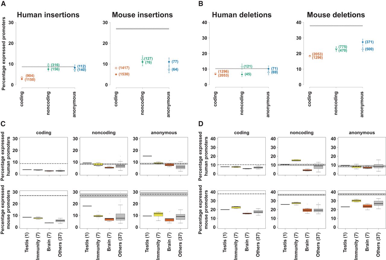 Recent promoter insertions and deletions in the human and mouse lineages. (A,B) The percentage of promoters of a particular class and expression profile which have been recently inserted (A) or deleted (B) in the human and mouse lineages. The closed diamonds represent broadly expressed promoters, while open diamonds show results for tissue-restricted promoters. The numbers of promoters in each category are shown in parentheses next to these points. The error bars represent the 95% confidence interval from 1000 samplings of the data with replacement. The gray bar shows the same 95% confidence interval for genome permuted intervals. The dashed line describes the mean of this expected distribution. (C,D) Percentage of promoters with tissue-biased expression that were inserted (C) or deleted (D), subdivided by biased tissue expression, where the number of samples for each tissue (described in Fig. 1F) is shown in parentheses. The gray bars show the 95% confidence interval for genome permuted intervals for each promoter class, while the dashed line shows the mean of this distribution.