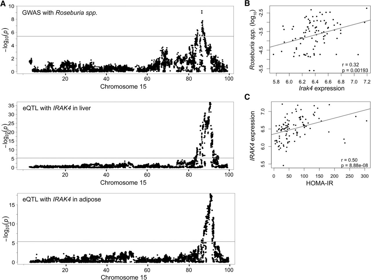 Chromosome 15 locus for abundance of genus Roseburia spp. (A) Overlapping genome-wide significant associations with the abundance of Roseburia spp. and liver and adipose eQTLs of the Irak4 gene in HMDP mice fed a HF/HS diet. The horizontal line indicates the threshold for genome-wide significance (P < 4 × 10−6). (B,C) Correlations of Irak4 adipose gene expression with the relative abundance of Roseburia spp. and HOMA-IR in the HMDP mice. (r) Biweight midcorrelation, (p) P value. See also Supplemental Tables 6 and 7.