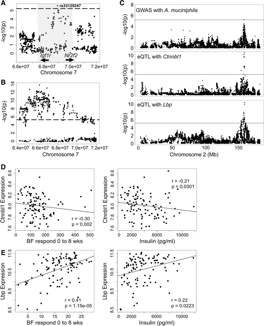 Chromosome 2 and 7 loci for abundance of A. muciniphila. (A) Locus plot for genome-wide significant association of A. muciniphila abundance to a Chromosome 7 locus, indicating the LD block (shaded in gray) and peak SNP rs33129247. Locations of candidate genes are indicated. (B) Locus plot for association with TG (triglyceride) at the Chromosome 7 locus. See also Supplemental Tables 6 and 7. (C) Chromosome 2 locus showing overlapping associations with the abundance of A. muciniphila and cis-eQTLs of the Ctnnbl1 and Lbp genes in adipose. (D) Correlation of epididymal adipose gene expression of Ctnnbl1 with body fat and insulin levels after 8 wk of the HF/HS diet. (E) Correlation of epididymal adipose gene expression of Lbp with body fat response and insulin levels after 8 wk of the HF/HS diet. (BF) Body fat, (r) biweight midcorrelation, (p) P value.