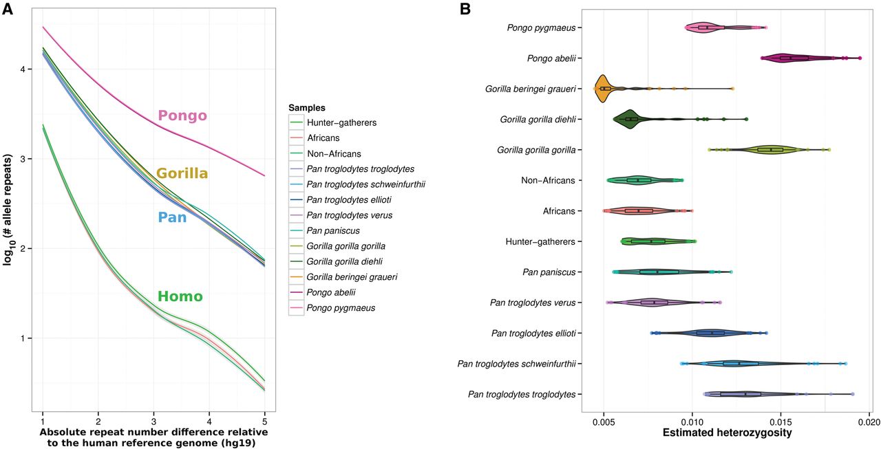 Repeat copy-number differences relative to human reference genome (hg19) and heterozygosity estimates for several nonhuman great apes species and human groups. (A) Absolute repeat number differences relative to the human reference genome estimated to occur for different human groups and subspecies/species of nonhuman primate taxa. The x-axis shows the number of repeat copy-number differences; the y-axis, the number of events for each repeat number difference in log10 scale. As expected, humans show the fewest differences relative to the human reference genome and are followed by chimpanzees, bonobos, gorillas, and orangutans. Within humans, African hunter-gatherers show the most variation, followed by Africans and non-Africans. (B) Heterozygosity estimates for different human groups and subspecies/species of nonhuman primate taxa. These results show great concordance with previous genetic surveys using millions of SNPs.