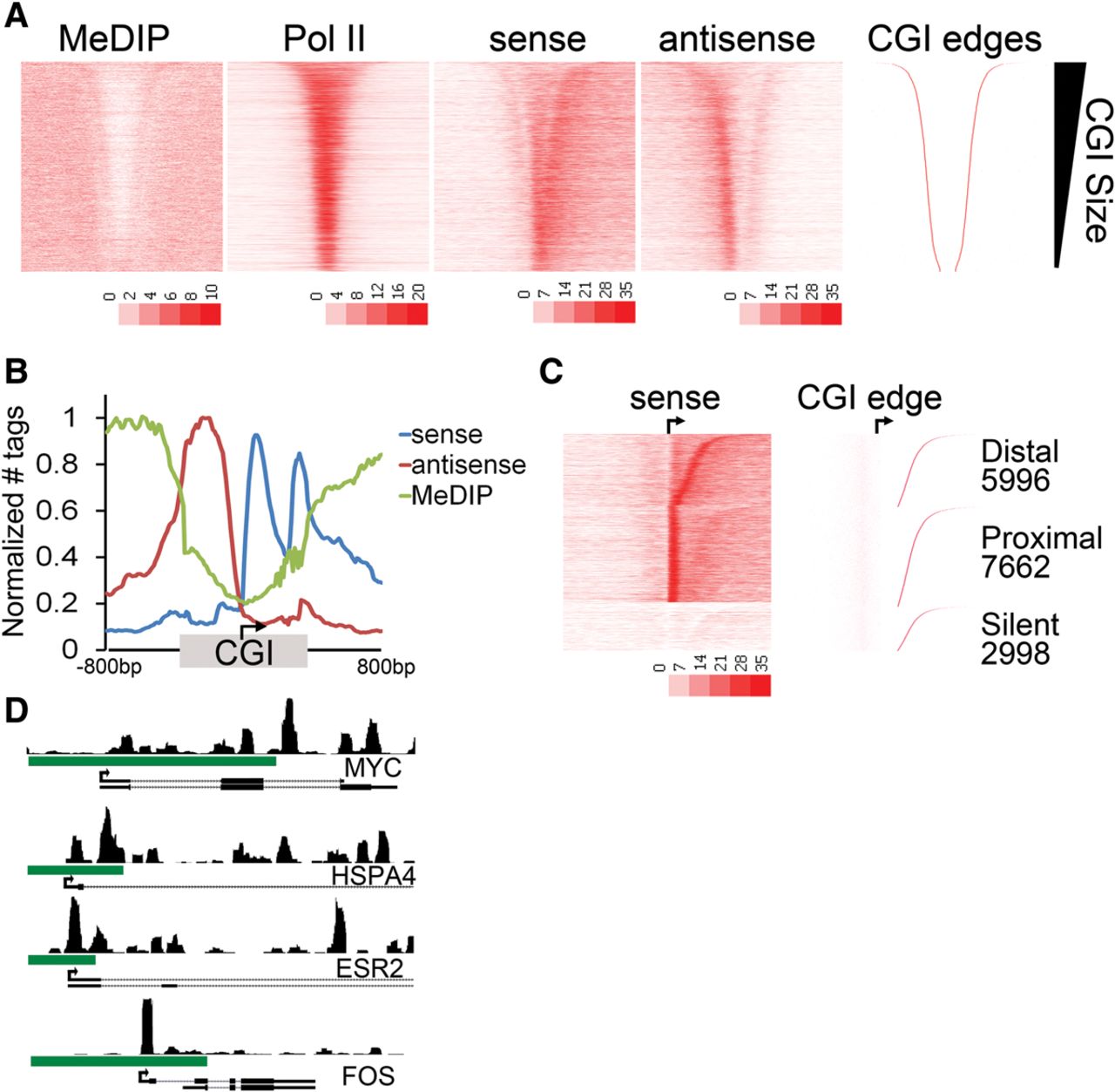 A second (distal) Pol II pause at the CGI shore. (A) Heatmap representation of MeDIP-seq, total Pol II ChIP-seq, and GRO-seq sense (plus strand) and antisense (minus strand) tag density is plotted for ±3 kb around the midpoint of the CGI and sorted by CGI size (CGI-associated promoters; n = 16,657). The upstream and downstream boundaries of the CGI domain (right) is shown for comparison. (B) Average tag densities of nascent transcripts (GRO-seq; sense, antisense) and DNA methylation (MeDIP-seq) across CGI-associated promoters. Promoters were oriented to the direction of transcription, and the distances from the TSS to the upstream and downstream CGI edge were independently scaled and anchored to the TSS (arrow). An additional 800 bp to either side of the CGI (unscaled) is included. Data are normalized between data sets by setting the maximum tags per 20 bp bin within each data set to one. (C) The relative GRO-seq tag density for the 100 bp under the proximal peak versus the 100 bp at the CGI edge was used to parse genes into proximal or distal pausing classes. Promoters with no tags in either region were considered silent. CGIs in each class were sorted by the distance from the TSS to the downstream CGI edge (indicated to the right). (D) Browser image of MCF7 GRO-seq sense tags covering an 8-kb window surrounding the promoter regions of MYC, HSPA4, ESR2, and FOS. Green bar indicates CGI.