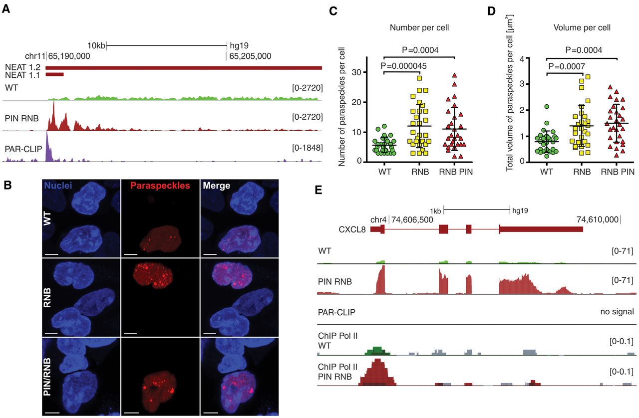 DIS3 dysfunction leads to NEAT1 lncRNA overexpression and the accumulation of paraspeckles. (A) A genome browser screenshot of the genomic region encompassing the NEAT1 locus with reads for mapped RNA-seq and DIS3 PAR-CLIP. (B) Fluorescent images of HEK293 cells transfected with constructs encoding the paraspeckle component NONO fused with mCherry. Nuclei were stained with Hoechst. White bars represent 5 µm. (C) The distribution of number of paraspeckles per cell in WT, RNB, and PIN RNB mutant cell populations. (D) Total volume of paraspeckles in a single cell, in WT, RNB, and PIN RNB mutant cell populations. (E) A genome browser screenshot of the genomic region encompassing the CXCL8 locus with mapped RNA-seq, RNA polymerase II ChIP-seq, and DIS3 PAR-CLIP reads (no signal). The mock control signals for Pol II ChIP are overlaid in scale on the respective tracks in gray color. Bars (C,D) represent the standard deviation from 28 measurements. P-values obtained using a t-test are shown. The uniquely mapped reads (A,E) are shown for the plus strand.