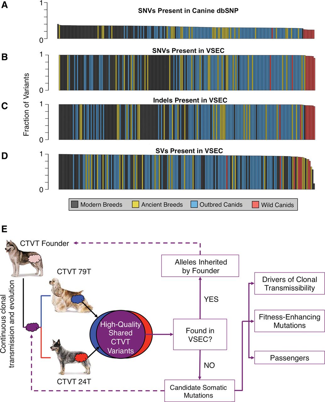 Founder-inherited versus somatic variation in CTVT. (A) Fraction of SNVs from 186 sequenced canids found in canine dbSNP (mean 32.65%). Sequenced canids included the two host dogs, 64 dogs representing 40 modern breeds, 27 dogs representing 12 ancient breeds, 86 outbred canids spanning four continents, and nine wild canids. (B–D) Fraction of SNVs, indels, and SVs found in a single canid that are present in at least one other canid in the panel (means of 99.55%, 99.57%, and 95.63%, respectively). (E) High-quality variants found in both CTVT tumors were compared against our Variant and Systematic Error Catalog (VSEC), which was generated from 186 canid whole-genome sequences. Consensus CTVT variants present in the VSEC catalog were presumed to be alleles inherited by the founder canid. Novel variants were treated as somatic mutations, some of which are crucial to clonal transmissibility. Dog images are from the American Kennel Club (http://www.akc.org).
