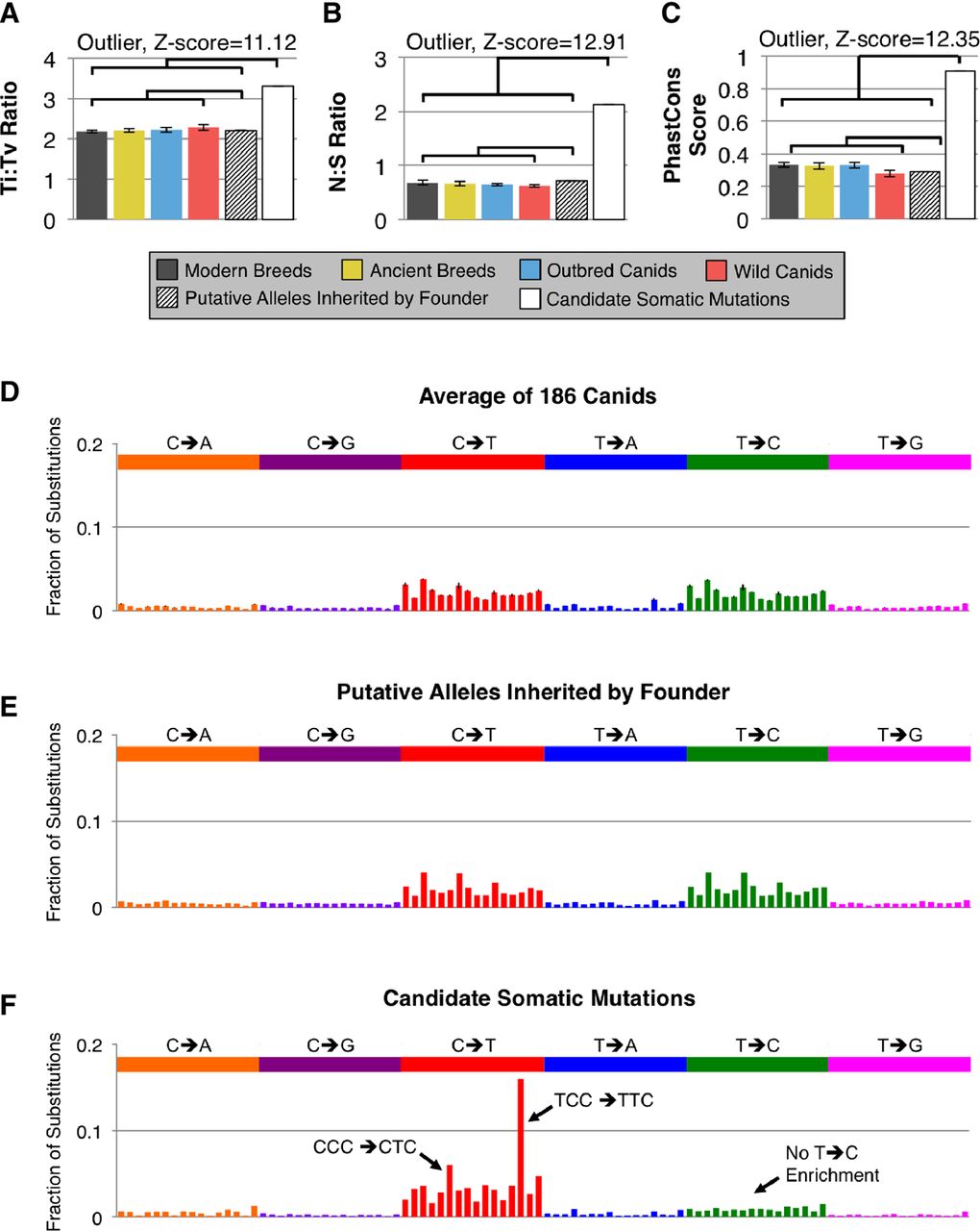 Candidate somatic mutations are highly enriched for true somatic mutations. (A–C) The transition–transversion (Ti:Tv) ratio, nonsynonymous–synonymous (N:S) ratio, and four-way PhastCons score at missense substitution sites for CTVT somatic variants were statistically significant outliers (two-sided Grubb's test, critical value of Z for 188 observations = 3.59) compared to both the canid WGS panel and the CTVT founder's inherited alleles. (D–F) Substitution profiles in their trinucleotide sequence context for germline variation averaged across the 186 canids (D), the CTVT founder's putative inherited alleles (E), and the candidate CTVT somatic mutations (F). Germline variants have more C>T and T>C variants than other substitutions, but no dramatic overrepresentation of surrounding sequence contexts. In contrast, the CTVT candidate somatic mutations are enriched for C>T transitions, especially TCC>TTC (15.9%) and CCC>CTC (6.0%). Notably, the enrichment of T>C substitutions is also absent from the CTVT candidate somatic mutations. For all three plots, the base substitutions are indicated by color and displayed relative to the reference pyrimidine base (i.e., C>A and G>T transversions are shown together). Each bar conveys the fraction of variants for which the indicated substitution occurs in the context of the adjacent bases in the reference sequence. For example, the leftmost bar represents the percentage of mutations that are ACA>AAA transversions.