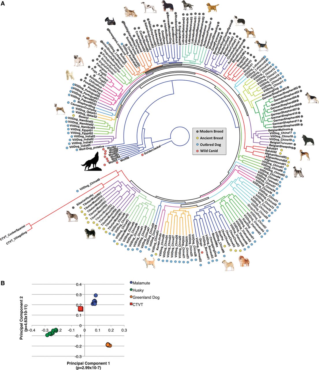 Dissection of the rebuilt founder canid's genome. (A) Maximum likelihood phylogeny of canine variation catalog using putative founder-inherited variant positions with clades colored by monophyly. The position of the CTVT germline genomes indicate that the founder was a post-wolf canine with closest similarity to a contemporary Arctic spitz breed. Observed acceleration on the CTVT branch is due to the use of all positions determined to vary from reference in the CTVT germline, therefore ensuring the proportion of these variant characters exceeds all other genomes. For the unrooted maximum likelihood tree with bootstrap support, see Supplemental Figure S3. (B) We used 135,833 SNPs from the Illumina HD chip and genotypes extracted from the tumor WGS to perform principal components analysis on the CTVT tumors and dogs from three Arctic spitz breeds. The CTVT founder was likely most genetically similar to the modern Alaskan malamute.