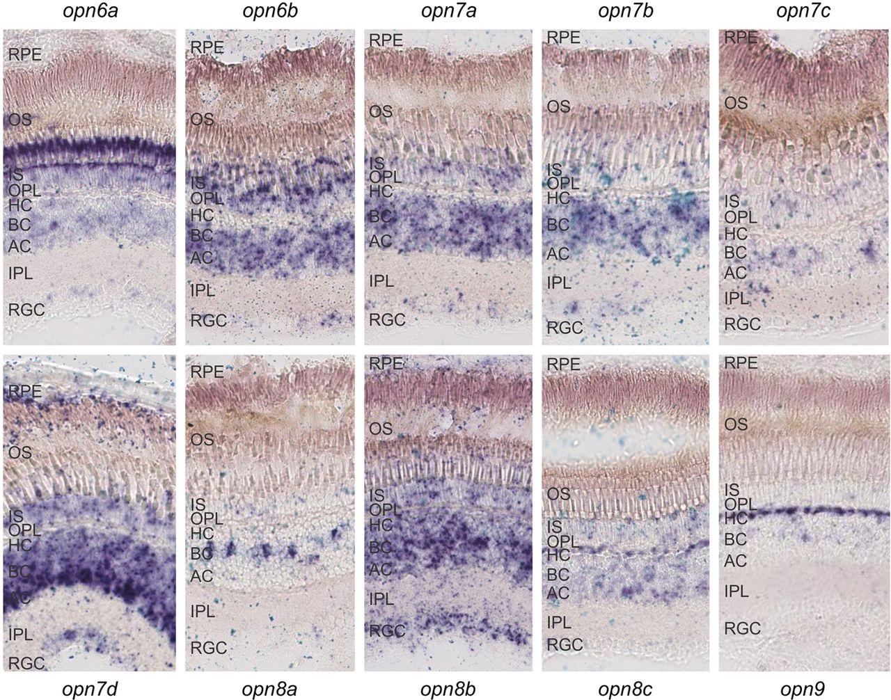 The localization of all 10 novel opsin transcripts in the adult zebrafish retina (sampled at ZT3) by RNA in situ hybridization, showing that each gene exhibits a discrete, partly overlapping expression profile. (RPE) Retinal pigment epithelium, (OS) outer segments, (IS) inner segments, (OPL) outer plexiform layer, (HC) horizontal cell layer, (BC) bipolar cell layer, (AC) amacrine cell layer, (IPL) inner plexiform layer, and (RGC) retinal ganglion cell layer.