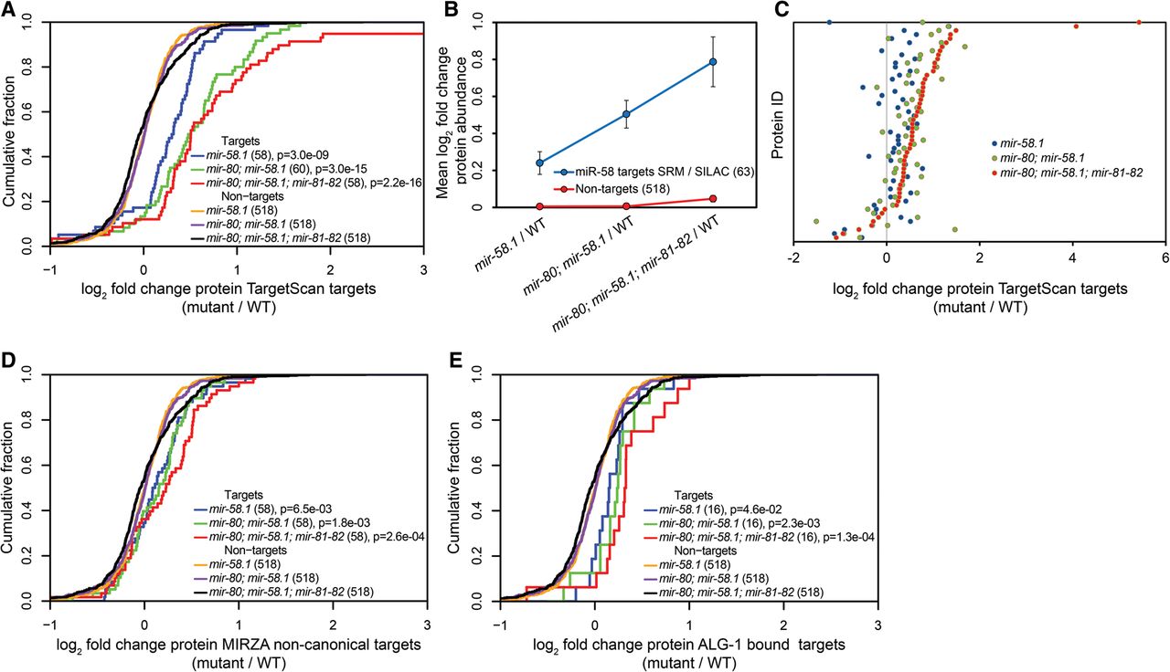 A combined selected reaction monitoring (SRM) and SILAC approach reveals additive target protein regulation of miR-58 family members. (A) Cumulative distributions of log2 fold expression changes of the 63 TargetScan-predicted miR-58 targets in the mir-58.1, mir-80; mir-58.1, and mir-80; mir-58.1; mir-81-82 mutants relative to the wild type (WT) indicate increased protein abundance with each miR-58 family mutation introduced. Quantified TargetScan-predicted targets identified in SRM, fractionated SILAC, and unfractionated SILAC were compared to a group of 518 nontargets identified in unfractionated SILAC measurements for which we also had transcript abundance data. P-values were calculated using Kolmogorov–Smirnov (KS) test comparing the fold change distributions (log2) of targets and nontargets. (B) Mean log2 fold changes of protein abundances of miRNA targets and nontargets in the different miR-58 family mutants relative to the WT indicate a cumulative effect of miRNA mutations. (C) Differential expression of 55 TargetScan-predicted miR-58 family targets quantified by SRM and unfractionated and fractionated SILAC in mir-58.1, mir-80; mir-58.1, and mir-80; mir-58.1; mir-81-82 relative to the WT. The protein ID indicates the specific protein quantified in different mutants relative to the WT. Proteins are sorted according to increasing up-regulation in the mir-80; mir-58.1; mir-81-82 quadruple mutant. It is apparent that each additional miRNA mutations further increases the expression of TargetScan-predicted targets compared with random controls. (D) Cumulative distributions of log2 protein-level fold changes of 58 noncanonical targets identified by MIRZA (score cutoff > 10) quantified by unfractionated and fractionated SILAC and of 518 nontargets described above in different miR-58 family mutant backgrounds. P-values were calculated using KS test comparing the fold change distributions (log2) of targets and nontargets. (E) Cumulative distributions of log2 protein-level fold changes of ALG-1–bound miR-58 family targets and of 518 nontargets described above in different miR-58 family mutant backgrounds compared with the WT. Requiring that a target reported by Grosswendt et al. (2014) is supported by at least five reads yielded 43 miR-58 family targets; of these, we obtained SILAC data for 16 targets. P-values were calculated using KS test comparing the fold change distributions (log2) of targets and nontargets.