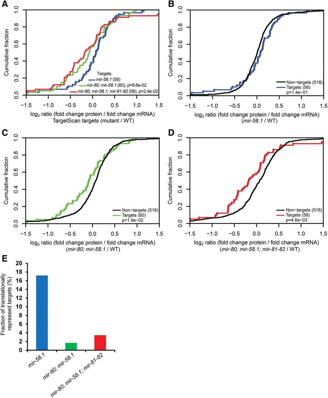 Reduced relative translation efficiency of miR-58 targets in multiple, but not single, miR-58 family mutants. (A–D) Translational efficiency calculated as log2 (fold change protein abundance/fold change mRNA abundance) for targets and 518 nontargets. P-values were calculated using a KS test comparing the fold change distributions (log2) of targets in mir-80; mir-58.1 double and mir-80; mir-58.1; mir-81-82 quadruple mutants to the mir-58.1 single mutant (A) and of targets to nontargets (B–D). (E) Release of translational inhibition is particularly prominent in the single mir-58 mutant. Fraction of translationally repressed [log2 fold change protein abundance (mutant/WT) > 0.05, log2 mRNA abundance (mutant/WT) < 0.05] TargetScan-predicted targets in mir-58.1 single, mir-80; mir-58.1 double, and mir-80; mir-58.1; mir-81-82 quadruple mutants.