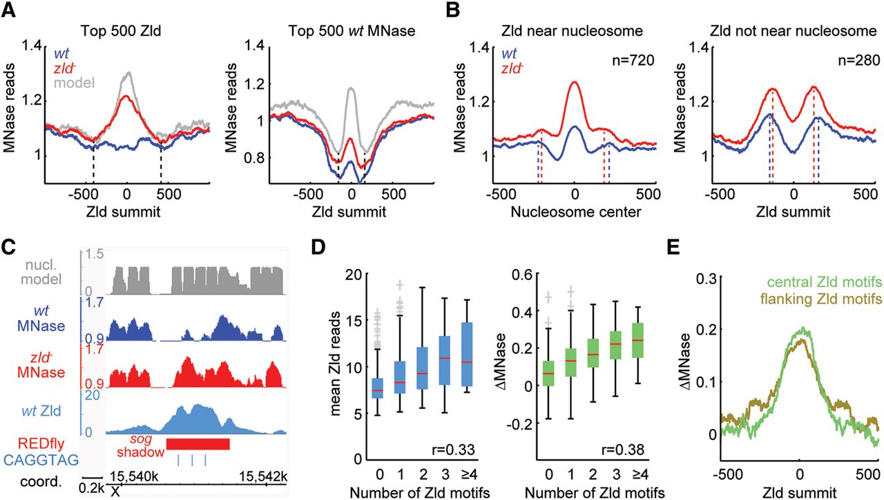 The effect of Zld on nucleosome occupancy is predominantly local. (A) Metaprofiles of nucleosome occupancy for the top 500 non-TSS Zld-bound regions as in Figure 3B, which are enriched for early enhancers (left), and the top 500 wt MNase regions (the most open regions) as in Figure 3C (right). For both plots, normalized MNase reads for wt (blue) and zld− (red), as well as the predicted nucleosome occupancy (gray) (Xi et al. 2010), were aligned to the Zld summits. Note the difference in width of the region with high nucleosome occupancy (black vertical dashed lines), suggesting that early enhancers have extended regions of high nucleosome occupancy. (B) Nucleosome positions in zld− MNase data were identified for the top 1000 non-TSS Zld-bound regions using the nucleR package (Flores and Orozco 2011). If the Zld summit mapped within 75 bp of a nucleosome center (n = 720), the normalized MNase data for wt (blue) and zld− (red) were aligned at the center of that nearest nucleosome (left). For the remaining Zld-bound regions without a nucleosome within 75 bp (n = 280), the data were aligned at Zld summits (right). Note that in both plots, there is a notable shift for the nucleosome phasing between wt (blue) and zld− (red), indicated by dashed lines. (C) IGB views showing predicted nucleosome model (gray track), wt MNase (blue track), zld− MNase (red track), Zld binding (light blue track), REDfly enhancer (red rectangle), and CAGGTAG Zld motifs (light blue vertical lines) at the sog shadow enhancer region. (D) Box-and-whisker plots showing Zld binding (as mean ChIP reads; left) and ΔMNase (the read count difference between zld− and wt; right) for the top 1000 non-TSS Zld peaks dependent on the number of Zld motifs within 125 bp of the Zld summits. The whiskers denote the interquartile range, and gray crosses mark outliers. Note that Zld binding and ΔMNase increase approximately linearly with increasing numbers of Zld motifs. (E) Metaprofiles of ΔMNase for regions with different configurations of Zld motifs among the top 1000 non-TSS Zld peaks. Regions with only 1 Zld motif within 125 bp of the Zld summit and at least one more Zld motif within 400 bp (flanking Zld motifs group; olive) have a wider profile than those with at least 2 Zld motifs confined within 125 bp of Zld summit and no more Zld motifs within 400 bp of the Zld summit (central Zld motifs group; green). Also note that the changes in nucleosome occupancy (ΔMNase) in the central Zld motif group, where the effect of Zld is confined, are strongest within 250 bp (1–2 nucleosomes) from the Zld summit, suggesting that Zld acts predominantly local.