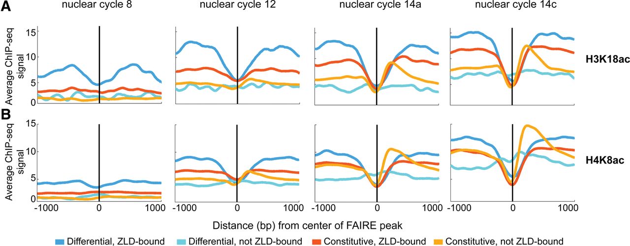 Early histone acetylation is enriched around loci that require Zld for chromatin accessibility. (A,B) Distribution of ChIP-seq signals for H3K18ac (A) and H4K8ac (B) surrounding individual classes of FAIRE peaks at specific nuclear cycles during the early stages of embryonic development. Colors indicate the different FAIRE classes. Plots are centered on the FAIRE peak and oriented relative to the transcription start site of the nearest gene.
