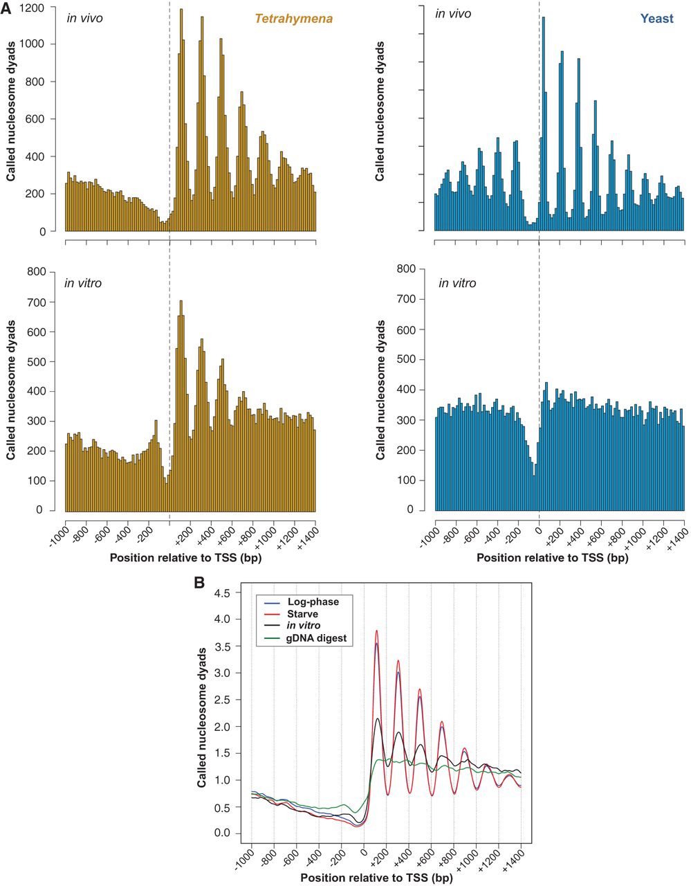 In vivo-like nucleosome organization without trans-acting factors. (A) Histograms of nucleosome positions relative to the TSS were computed from yeast and Tetrahymena MNase-seq data using the same bioinformatic pipeline. A phased distribution of nucleosome positions downstream from the TSS is observed in chromatin from log-phase Tetrahymena and yeast grown in rich media. Surprisingly, an in vivo-like pattern of nucleosome positioning is observed in vitro for Tetrahymena but not yeast. (B) Averaged nucleosome dyad counts around the TSS reveal an in vivo-like distribution of called nucleosomes within in vitro data. MNase-digested naked DNA does not resemble in vivo data (green curve), thus ruling out potential sequence biases associated with MNase preferences.