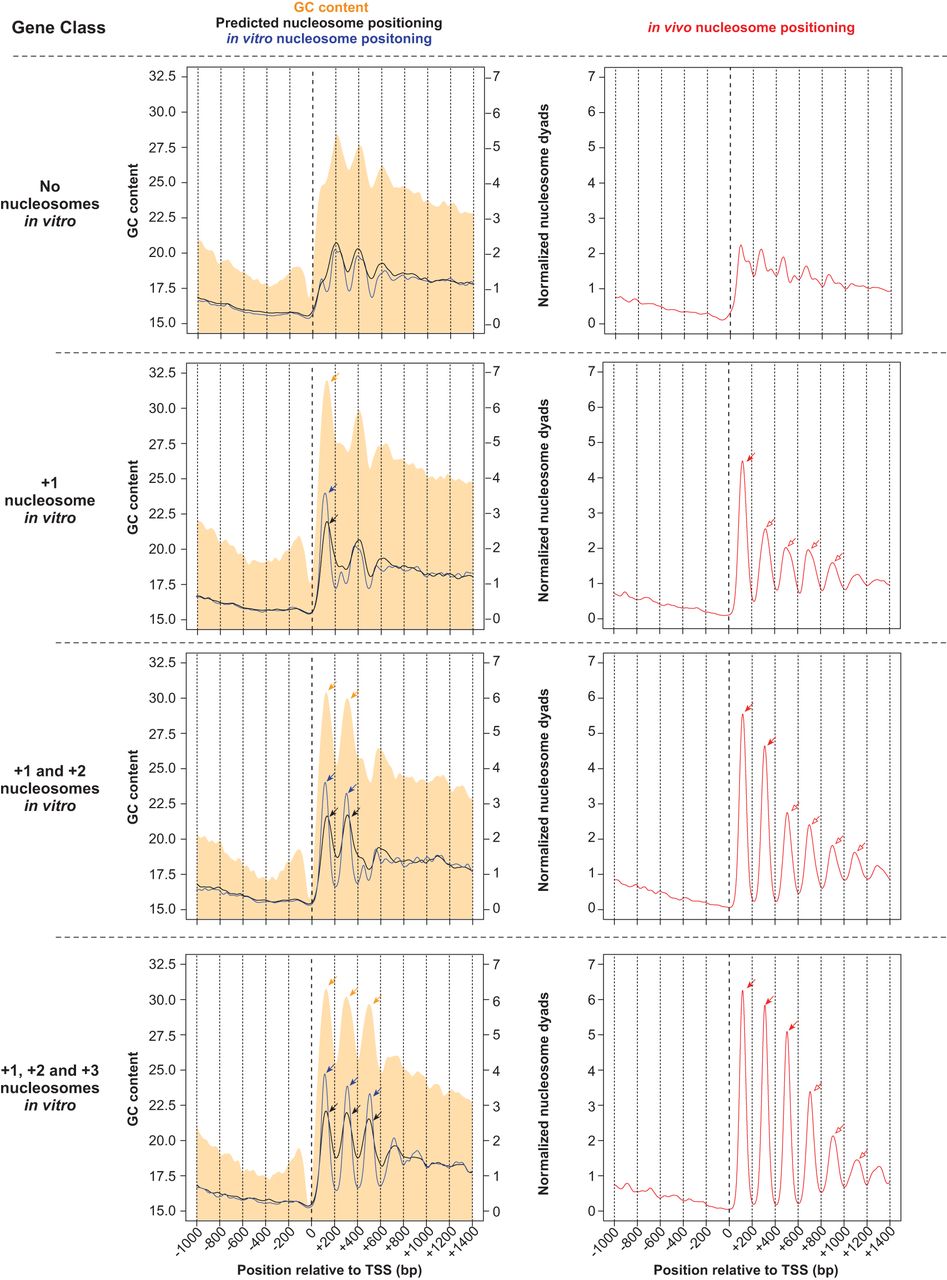 Standard in vitro nucleosomes coincide with GC content oscillations and are associated with increased nucleosome positioning in vivo. Tetrahymena genes were classified according to the number of standard in vitro nucleosomes downstream from their TSS. Nucleosome positioning data are obtained from in vitro (blue line) and in vivo (red line) experiments, as well as from predictions of a thermodynamic model formulated by Kaplan et al. (2009) (black line). Log-phase MNase-seq data were used as the in vivo sample. GC content is represented as a filled orange curve. Different gene classes are separated by horizontal dotted lines. The nucleosome-depleted region upstream of standard nucleosomes coincides with GC-poor DNA. Pronounced peaks in GC content (orange arrows) exhibit a ∼200-bp periodicity, and coincide with nucleosome positions in vitro (blue arrows). This is consistent with GC-rich DNA being intrinsically favorable for nucleosome formation. Genes with no standard nucleosomes in vitro (top row) exhibit an indistinct nucleosome pattern in vivo (right panel). On the other hand, genes with a +1 nucleosome in vitro (blue arrow within left panel) exhibit increased nucleosome positioning in vivo, not only at the +1 position (red filled arrow), but also around this region (red open arrows). A model based on nucleosome sequence preferences successfully predicts in vitro nucleosome positions (black arrows), which in turn overlap with in vivo nucleosomes (red filled arrows). However, the model fails to predict in vivo nucleosomes in surrounding regions (red open arrows), suggesting that such nucleosomes are instead positioned by trans-acting factors. These trends are also observed in other gene classes, with varying numbers of nucleosomes in vitro. DNA sequences favorable for nucleosome formation may thus function as nucleation sites that aid trans-acting factors in positioning nucleosomes in flanking regions in vivo.