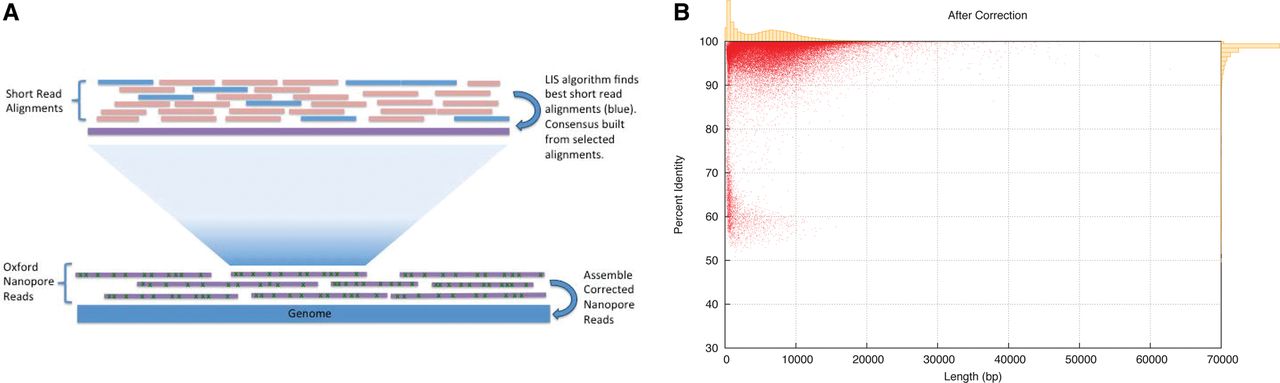 (A) Nanocorr workflow. Short high-identity reads are aligned to raw ONT reads. The best overlapping set is determined by the LIS algorithm, and a consensus sequence of these alignments is built using pbdagcon. Error-corrected reads can then be assembled using a long-read assembler. (B) Post-Nanocorr correction read length and accuracy. Scatter plot with marginal histograms summarizing the percent identity of reads after correction for W303. Average identity before correction is ∼68% for all iterations of flow cells, while the average post-correction identity was >97%.