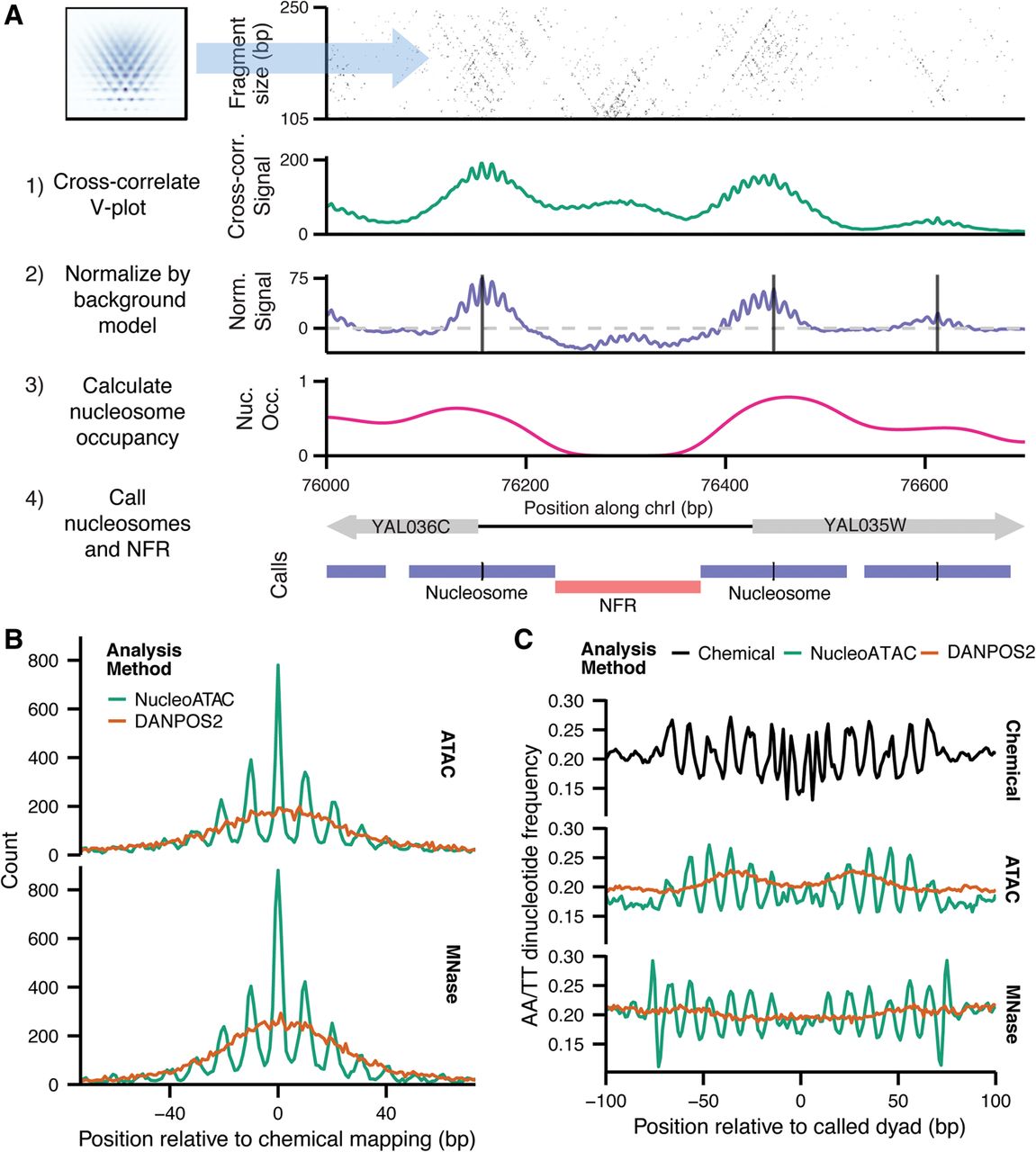 NucleoATAC enables high-resolution nucleosome positioning. (A) Schematic of NucleoATAC workflow. First, the V-plot nucleosome signature is cross-correlated against a 2D fragment size versus fragment midpoint representation of ATAC-seq data at a locus. The signal is then normalized by a background model (based on sequence bias and read depth) to obtain a normalized signal. Nucleosome occupancy is calculated using the local fraction of nucleosomal fragments. The normalized cross-correlation signal and nucleosome occupancy tracks are used to assign nucleosome and nucleosome-free (NFR) positions. (B) Distance of dyad calls from different assays (ATAC on top panel; MNase on bottom) using either NucleoATAC (green) or DANPOS2 (orange). (C) AA/TT dinucleotide pattern around nucleosome dyad calls determined by chemical mapping (top panel), or from ATAC-seq (middle panel), or MNase-seq (bottom panel) using either NucleoATAC (green) or DANPOS2 (orange).
