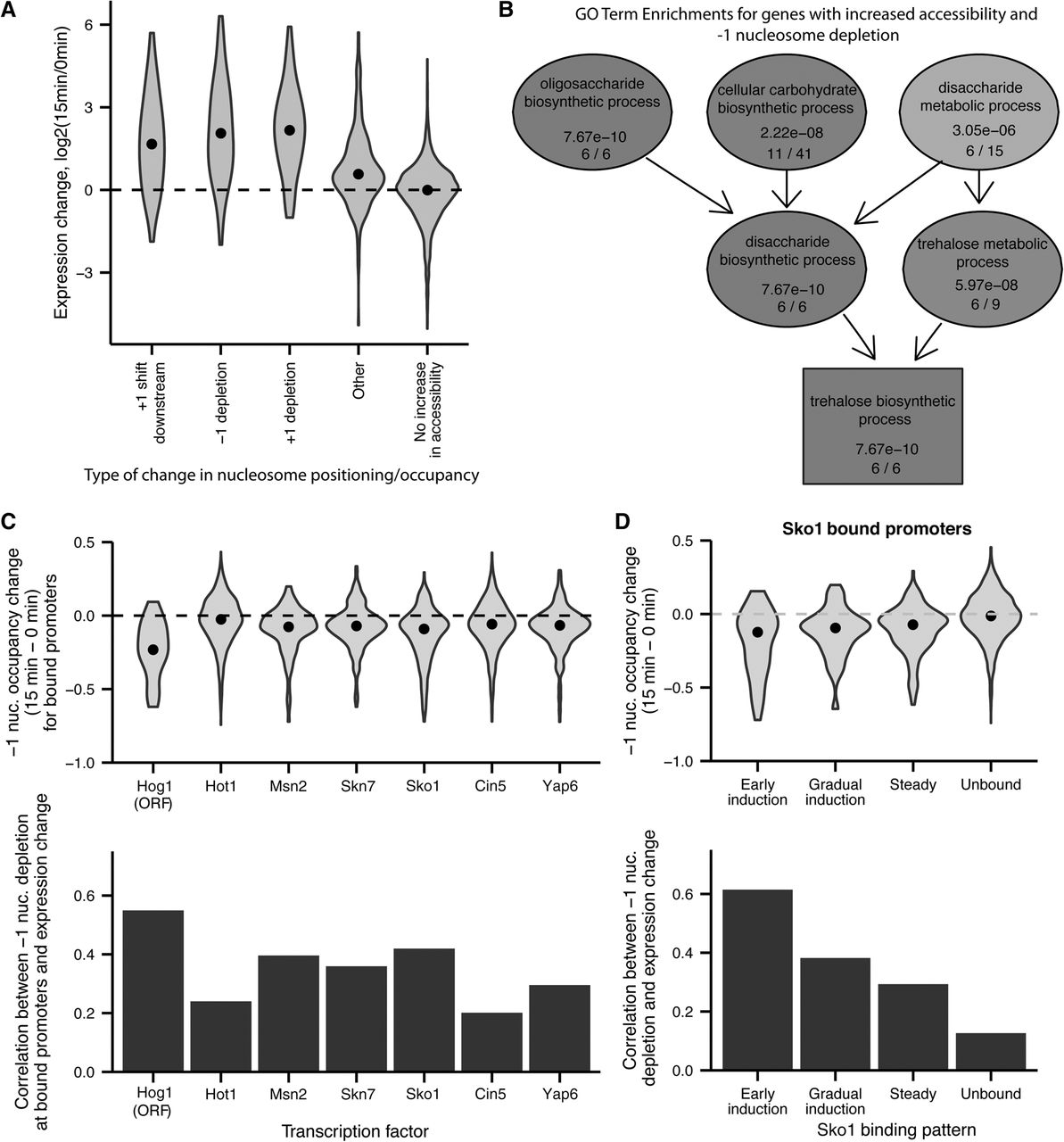 Changes in nucleosome positioning and occupancy during osmotic stress are linked to expression changes and mediated by TF binding. (A) Distribution of expression changes for promoters showing increased accessibility as well as different types of changes in nucleosome positioning or occupancy. (B) GO Term enrichment graph for genes with increased accessibility and depletion of the −1 nucleosome during the first 15 min of osmotic stress. (C) Distribution of changes in −1 nucleosome occupancy (top) and correlation between −1 nucleosome depletion and expression increases (bottom) for promoters bound by different TFs. (D) Distribution of changes in −1 nucleosome occupancy (top) and correlation between −1 nucleosome depletion and expression increases (bottom) for promoters with different Sko1 binding patterns.