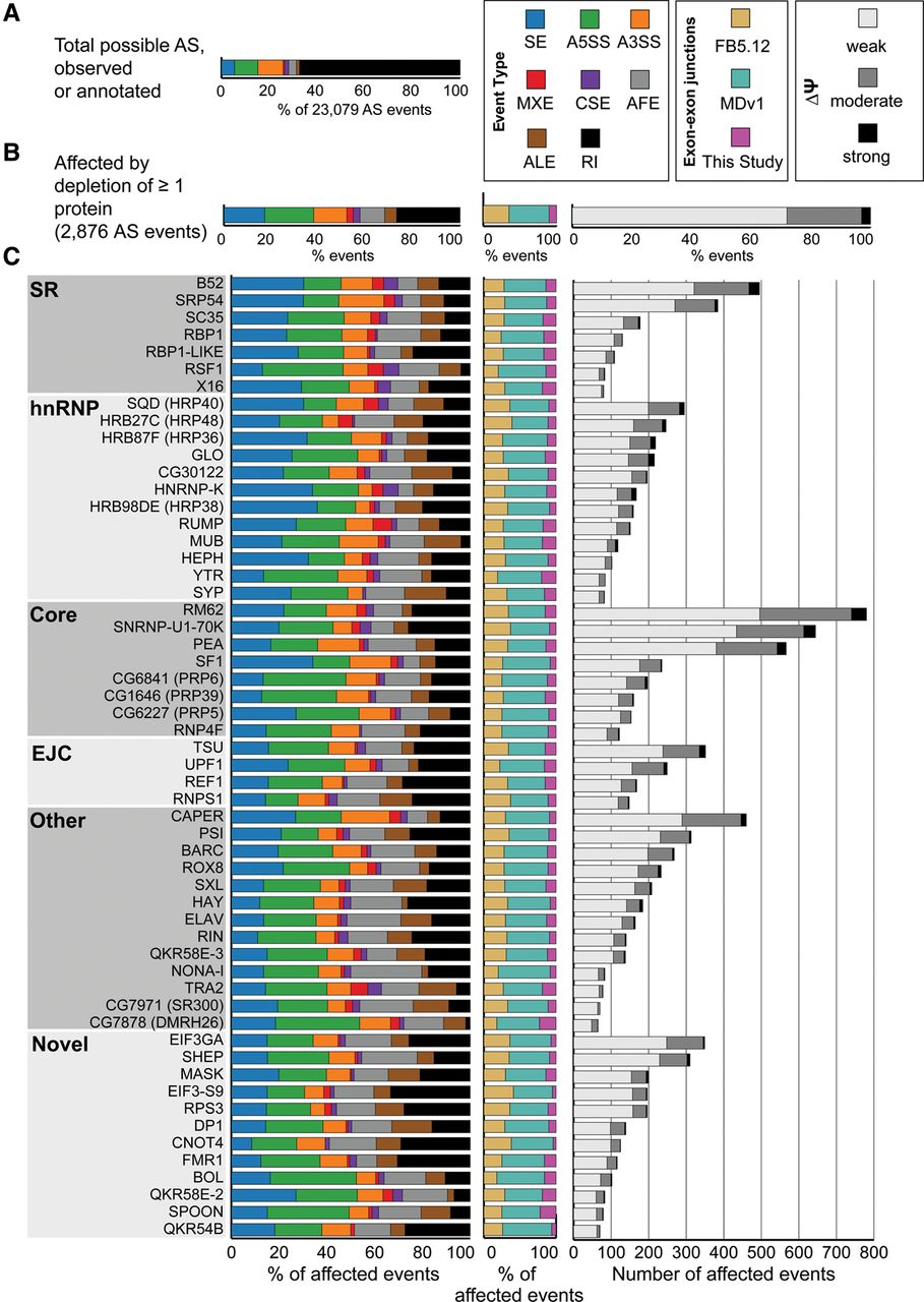 Alternative splicing (AS) events affected by depletion of 56 RNA binding proteins. (A) The proportion of each type of AS event that could potentially be regulated by each protein. (B) The observed proportion of each type of splicing event affected by depletion of at least one protein is shown alongside the type of exon–exon junctions involved in the splicing event. (C) The number, magnitude, type of AS, and type of exon–exon junction affected by each individual knockdown is shown. Each protein is categorized as SR, hnRNP, core splicing factor, exon junction complex (EJC), other known, or novel splicing regulator protein. The legend in the top right indicates the color codes used for the splicing event types. (SE) skipped/cassette exon, (A5SS) alternative 5′ splice site, (A3SS) alternative 3′ splice site, (MXE) mutually exclusive exons, (CSE) coordinate skipped/cassette exon, (AFE) alternative first exon, (ALE) alternative last exon, (RI) retained intron. In addition, the legend indicates whether the exon–exon junctions were found in FlyBase 5.12, MDv1 (Graveley et al. 2011), or novel to this study, as well as whether the magnitude of splicing changes observed were weak, moderate, or strong.