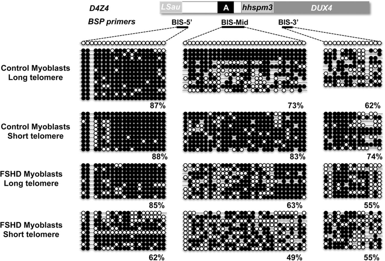 Telomere shortening is associated with D4Z4 hypomethylation in FSHD cells. The absolute level of DNA methylation at a single nucleotide level was determined by sodium bisulfite sequencing for three different regions within the D4Z4 sequence: BIS-5′ (21 CpGs represented by dots), BIS-mid (31 CpGs), and BIS-3′ (14 CpGs). For each sequence, several clones were analyzed from DNA obtained from control myoblasts with long or short telomeres and FSHD myoblasts with long or short telomeres. The distribution of methylated (black dots) or unmethylated (white dots) is represented for the different clones analyzed in the different conditions. The average percentage of methylation is indicated for each sequence.