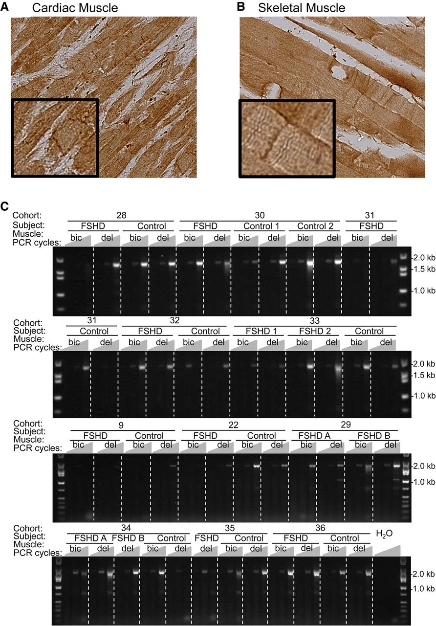SORBS2 gene expression in skeletal muscle biopsies. Immunohistochemistry (IHC) staining of transversal biopsies of cardiac (A) and skeletal (B) muscle for the detection of SORBS2 (Epitomics, RB19714). (C) RT-PCR of a SORBS2 transcript variant (Exon 17–42) in skeletal muscle biopsies from biceps (bic) and deltoid (del) isolated from FSHD patients (FSHD A, B) and their unaffected siblings (control) for a total of 12 cohorts. For each sample, three PCRs were performed using 35, 40, or 45 amplification cycles. In these RT-PCR assays, all transcript variants that include exons 17 and 42 (23 variants, including eight protein-coding forms) are amplified.