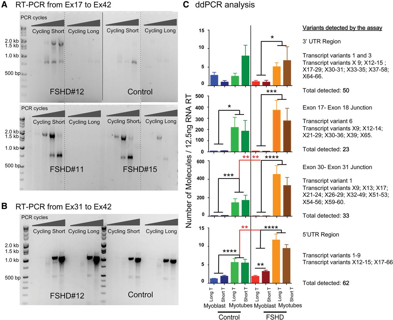 TPE-OLD modifies SORBS2 expression in FSHD myoblasts. (A,B) Amplification of SORBS2 transcripts in FSHD and sibling control myoblasts with long and short telomeres. (A) RT-PCR of SORBS2 transcripts using primers amplifying all known transcript variants that include exons 17 and 42 (23 variants). Assay performed in FSHD#12 and sibling control, FSHD#11, and FSHD#15 myoblasts with long and short telomeres. Only FSHD myoblasts with short telomeres express the 2-kb splice forms (23 variants, including eight protein-coding forms). (B) RT-PCR performed using a set of primers amplifying all known transcript variants between exons 31 and 42 (a total of 30 forms). Among the 30 isoforms detected, 13 exclude the totality of exon 40 (smaller form at ∼530 bp), among which are the nine protein-coding variants. (C) Gene expression analysis of SORBS2. For all four assays, we report the predicted transcripts according to the NCBI database. ddPCR results are expressed as the number of molecules detected in a 12.5-ng RT input; values are averages ± SEM.