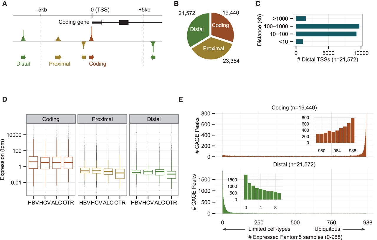 The transcriptome of HCC tumors contains a large number of distal noncoding transcripts. (A) Schematic representation of the coding, proximal, and distal CAGE peaks. (B) Numbers of peaks in the different groups. (C) Distribution of distances between distal peaks and their closest coding peaks. (D) Expression levels in the different groups for the indicated etiologies. The data are means over tumors belonging to a given etiology group (tpm: tags per million + 0.001). (E) Expression patterns of coding and distal peaks across human body (988 human expression data from the FANTOM5 project). We counted the numbers of tags located within each TSS region in each sample, and then the number of samples that expressed tumor transcripts with the criterion of at least one tag. Coding peaks are ubiquitously expressed, whereas distal peaks are only expressed in limited cell types. Proximal and distal peaks show a similar expression pattern (Supplemental Fig. S1D).