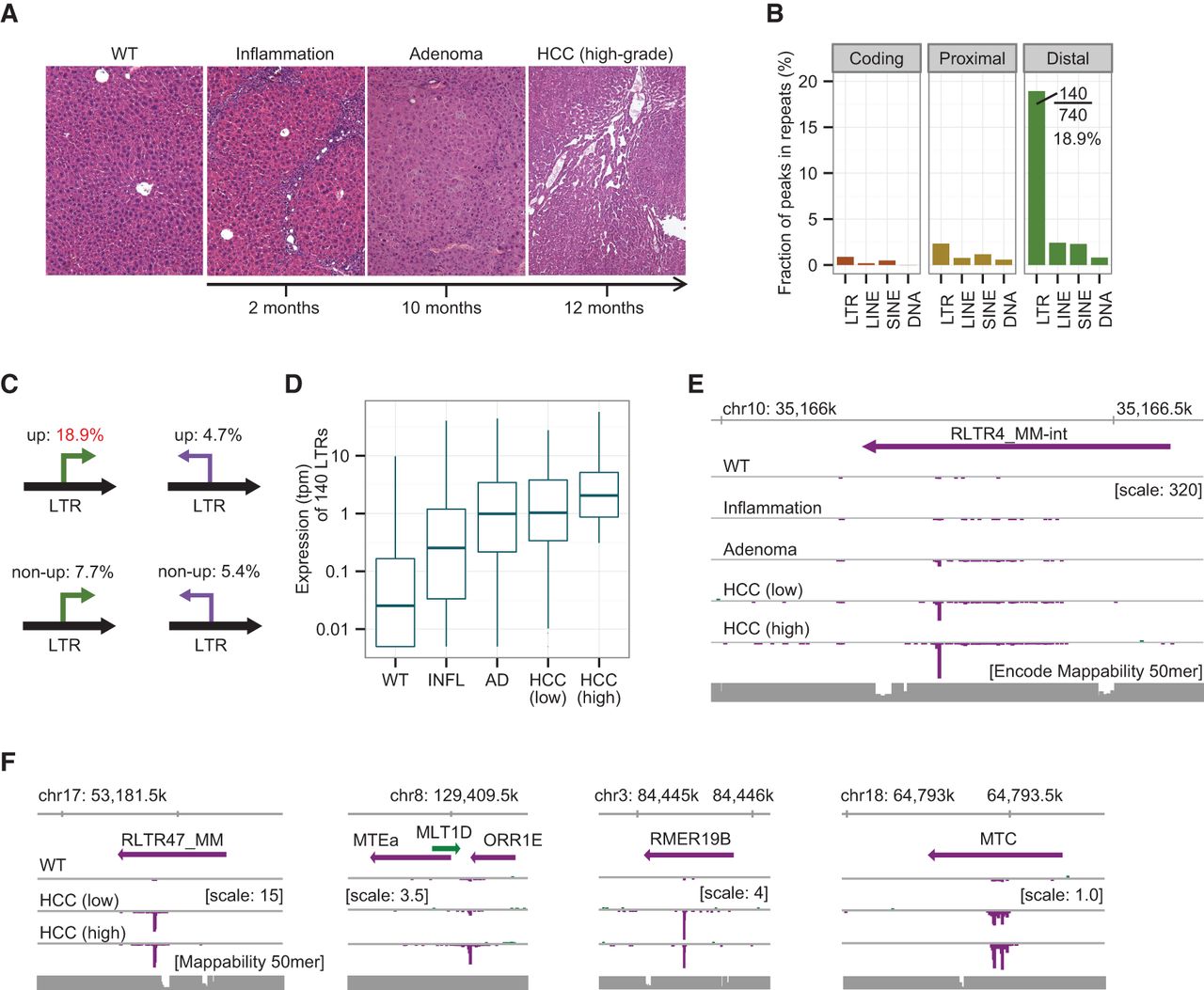LTR promoters are activated in mouse HCCs. (A) Representative liver histological sections at the indicated stages of carcinogenesis in Mdr2 KO mice. (B) Fraction of peaks overlapping with repetitive elements in the sense direction. Nearly 19% (140/740) of up-regulated distal peaks overlap with LTR elements. (C) Fractions of peaks overlapping with LTRs according to the (sense versus antisense) direction of transcription and the degree of up-regulation. (D) Expression levels of the 140 LTRs in normal (WT), inflammatory (INFL), adenoma (AD), low-grade, and high-grade HCC tissues. The data are means over tumors belonging to a given histological group (tpm + 0.005). (E) CAGE signal of the most significantly up-regulated LTR promoter at the indicated stages of the liver disease. The signal increases as the disease develops. CAGE tags are pooled for each group and visualized using the ZENBU Browser. (F) Expression patterns of LTRs selected from four different subfamilies.