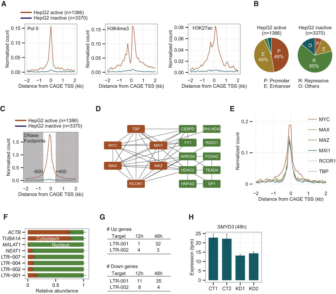 A subset of up-regulated distal ncRNAs including LTRs and non-LTRs has active histone marks and TF binding sites in the HepG2 cell line. (A) Enrichment of ChIP-seq peaks for RNA Pol II, H3K4me3, and H3K27ac within 2 kb from the center of the CAGE peaks in 100-bp bins. The red and blue lines represent active and inactive peaks in the HepG2 cell line, respectively. (B) Chromatin states annotated by ENCODE based on combinatorial patterns of chromatin marks for the HepG2 active and inactive loci. (C) Distribution of DNase I footprints within 2 kb from the center of the CAGE peaks in 100 bp bins. (D) The co-occurrence of transcription factors at up-regulated distal ncRNA loci. Nodes are connected by a solid line if their Jaccard Index is above 0.5. Nodes shown in red are fully connected to one another. (E) Enrichment of ChIP-seq peaks for the fully connected six TFs within 2 kb from the center of the CAGE peaks in 100-bp bins. (F) Relative abundance of four LTR ncRNAs in nucleus and cytoplasm with ACTB, TUBA1A, MALAT1, and NEAT1 as cytoplasmic and nuclear controls. (G) Numbers of significantly up-regulated genes after 12 and 48 h of knocking down LTR-001 and 002. (H) Expression levels of SMYD3 measured by CAGE in CT (control) and KD (knockdown) samples at 48 h of the ASO treatment.