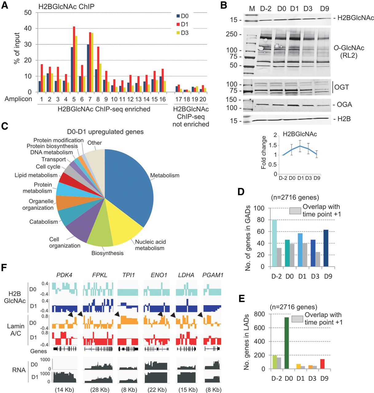 Adipogenic induction results in up-regulation of metabolic genes, lamin A/C dissociation from these genes, and in a transient increase in H2BGlcNAc. (A) ChIP-qPCR analysis of H2BGlcNAc on enriched and nonenriched loci on D0, D1, and D3 of differentiation. (B) Western blot analysis of H2BGlcNAc, total O-GlcNAc (RL2 antibody), OGT, OGA, and H2B throughout differentiation. Graph shows mean H2BGlcNAc levels at each time point relative to D−2 (levels standardized to H2B; mean ± SD of four experiments). (C) Gene ontology enrichment classification for the 2716 genes up-regulated on D1 (see Supplemental Fig. 4A,B). Note the high proportions of metabolic genes. (D,E) Localization of D0-D1 up-regulated genes in GADs (D) and lamin A/C LADs (E), and maintenance of these genes within GADs or LADs between consecutive differentiation time points (gray bars). (F) H2BGlcNAc and lamin A/C ChIP-seq profiles on PDK4 and indicated glycolytic HIF1A-target genes. Arrows point to losses of lamin A/C from promoters, coinciding with transcriptional up-regulation of the genes. RNA-seq profiles are shown (scale 0–1000 FPKM).