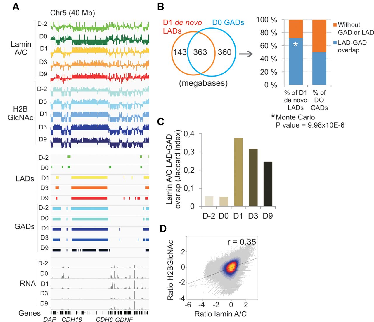 Lamin A/C LADs form de novo on chromatin domains pre-enriched in H2BGlcNAc within 1 day of adipogenic induction. (A) Browser views of LADs and GADs during adipogenic differentiation. (B) Venn diagram analysis of overlap of de novo LADs formed on D1 with preexisting D0 GADs maintained on D1 (in megabases): Data show that 71% of de novo LAD coverage overlaps with preexisting GADs, reflecting a nonrandom association (permutation t-test P value = 9.98 × 10−6), and this de novo association concerns 50% of GADs. (C) Jaccard index of overlap of lamin A/C LADs with GADs during differentiation. (D) Genome-wide H2BGlcNAc levels positively correlate with lamin A/C levels (D1).
